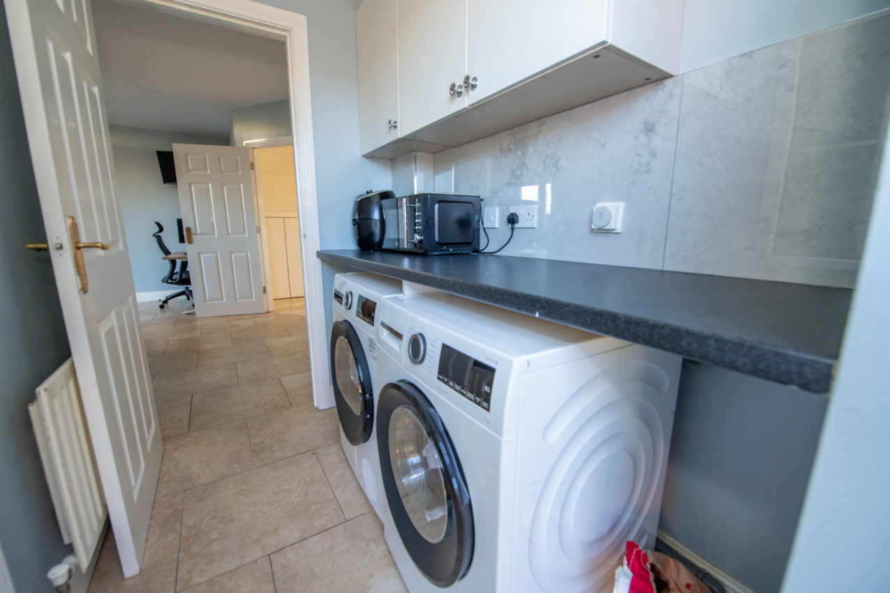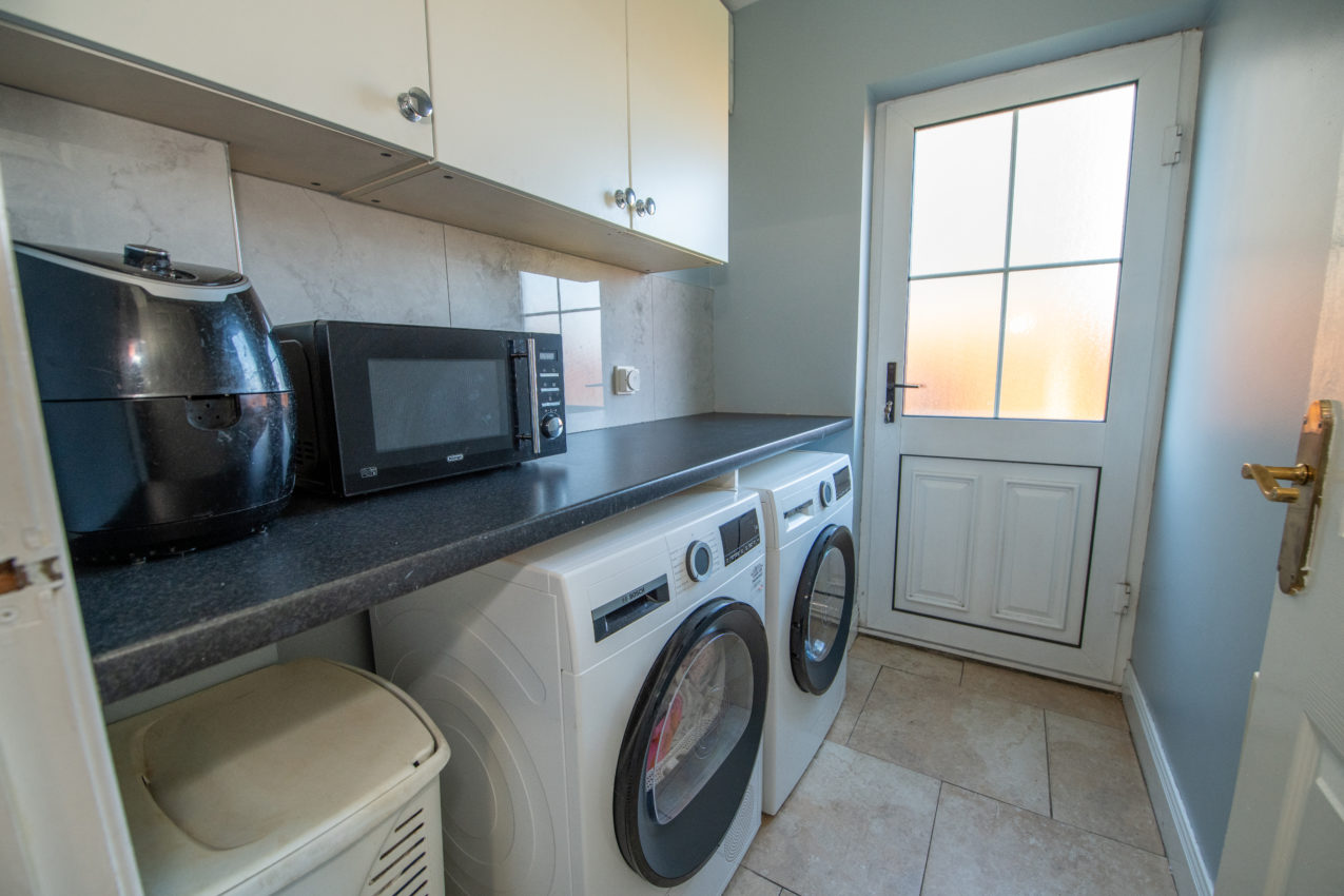Utility Room; 1.97m x 1.51m wall units, worktop space with tiled surround walls, plumbed for a washing machine & wired for a tumble dryer, tiled flooring, half-glazed white PVC door to the rear garden