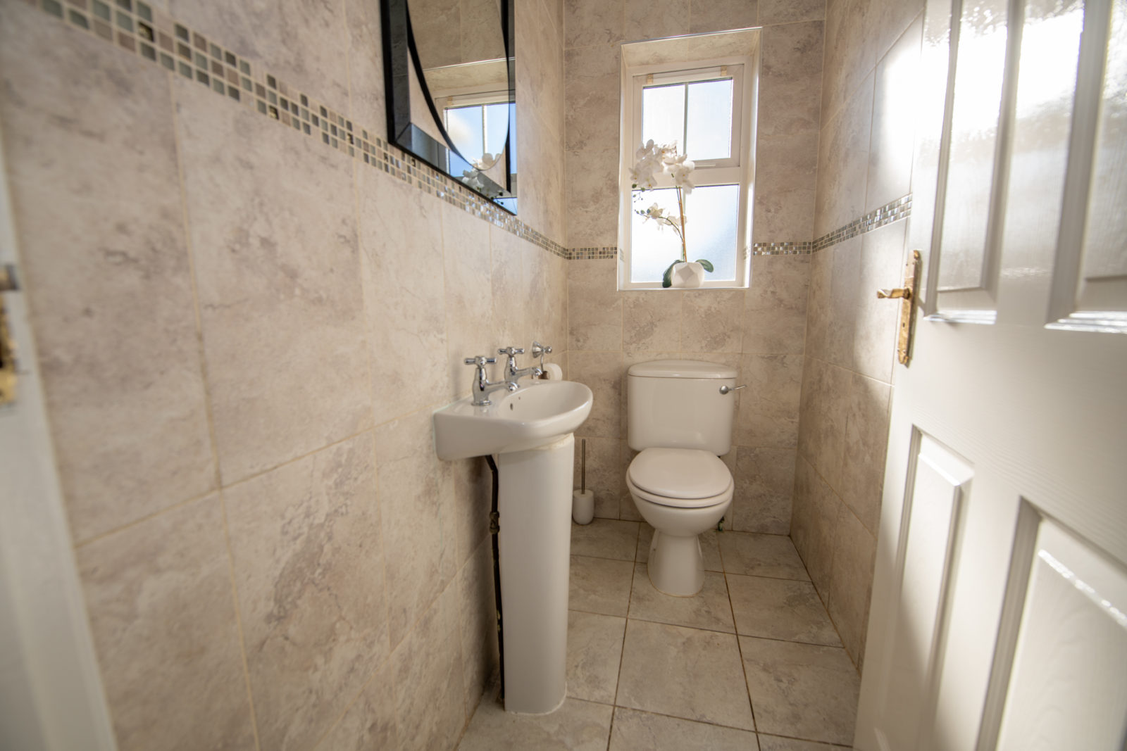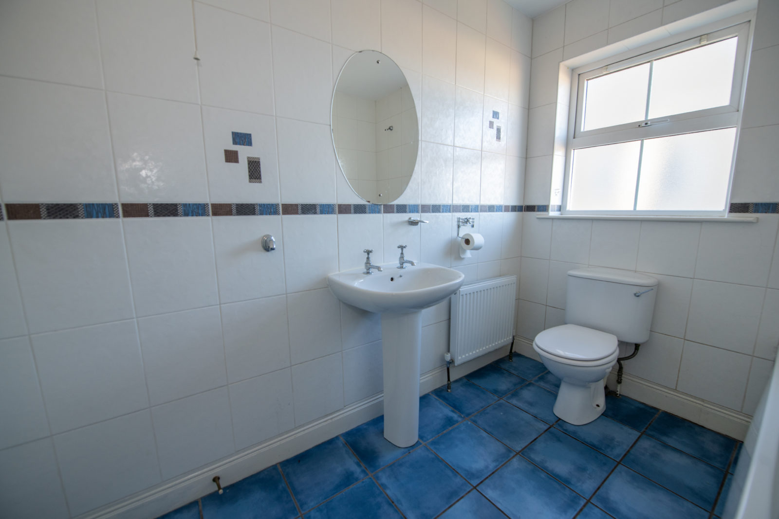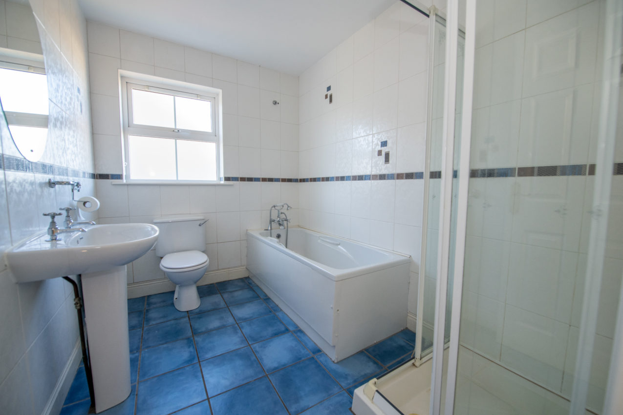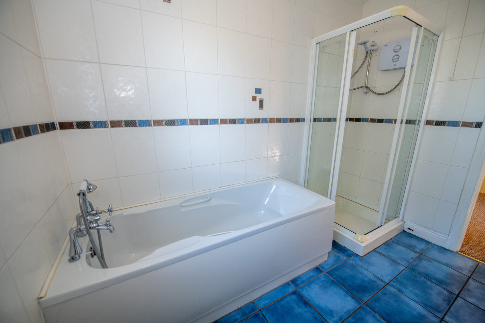 Family Bathroom; 2.78m x 2.00m white three-piece suite and separate fully tiled shower enclosure with Triton T90 electric shower, fully tiled walls & tiled flooring, chrome fittings provide a clean, modern finish