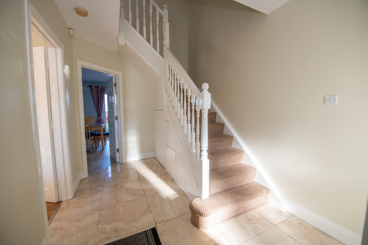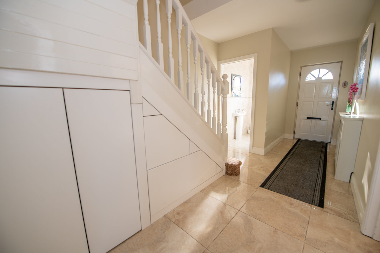 Entrance Hallway; 2.37m x 5.57m tiled flooring, built-in under-stair recess for additional storage, door to;