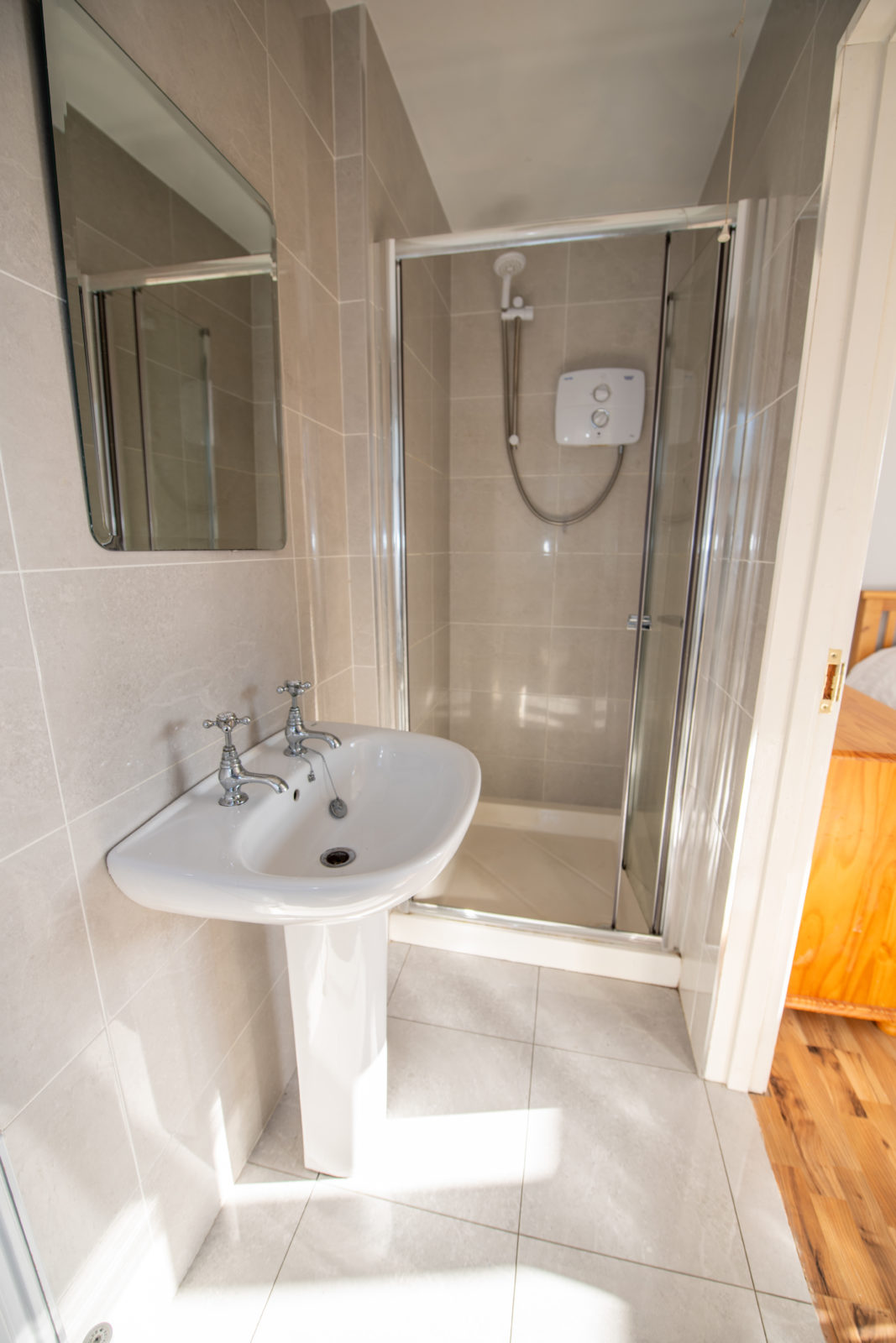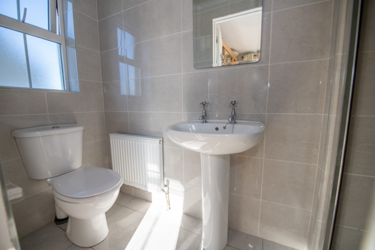 Ensuite; 2.78m x 0.99m white two-piece suite and separate fully tiled shower enclosure with Triton T90 electric shower, chrome fittings, fitted mirror, Fully tiled walls & tiled flooring