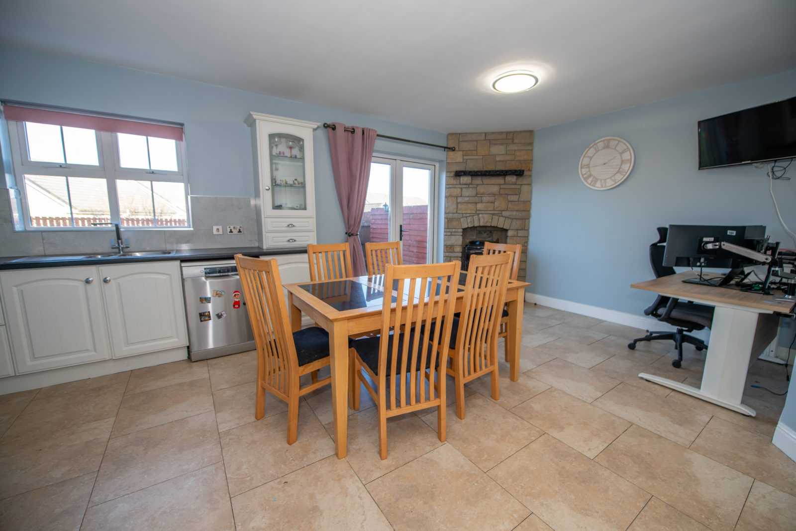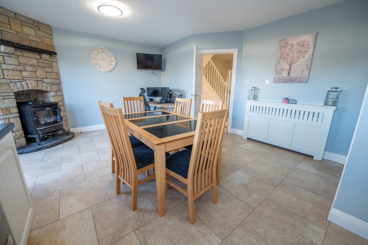 Kitchen / Dining Area; 6.73m x 4.30m comprehensively fitted with painted wall & base units, work surfaces with tiled splashbacks, stainless steel single drainer sink unit with a separate waste bowl, glazed display units, four-ring electric hob & oven with extractor hood overhead, integrated fridge/freezer, plumbed for dishwasher, TV point, radiator cover, tiled flooring, a Stanley Reginald solid fuel stove with back boiler is set within a local stone fireplace on a raised hearth, creating a warm & character-filled focal point, double fully glazed white PVC doors to the rear garden, door to;