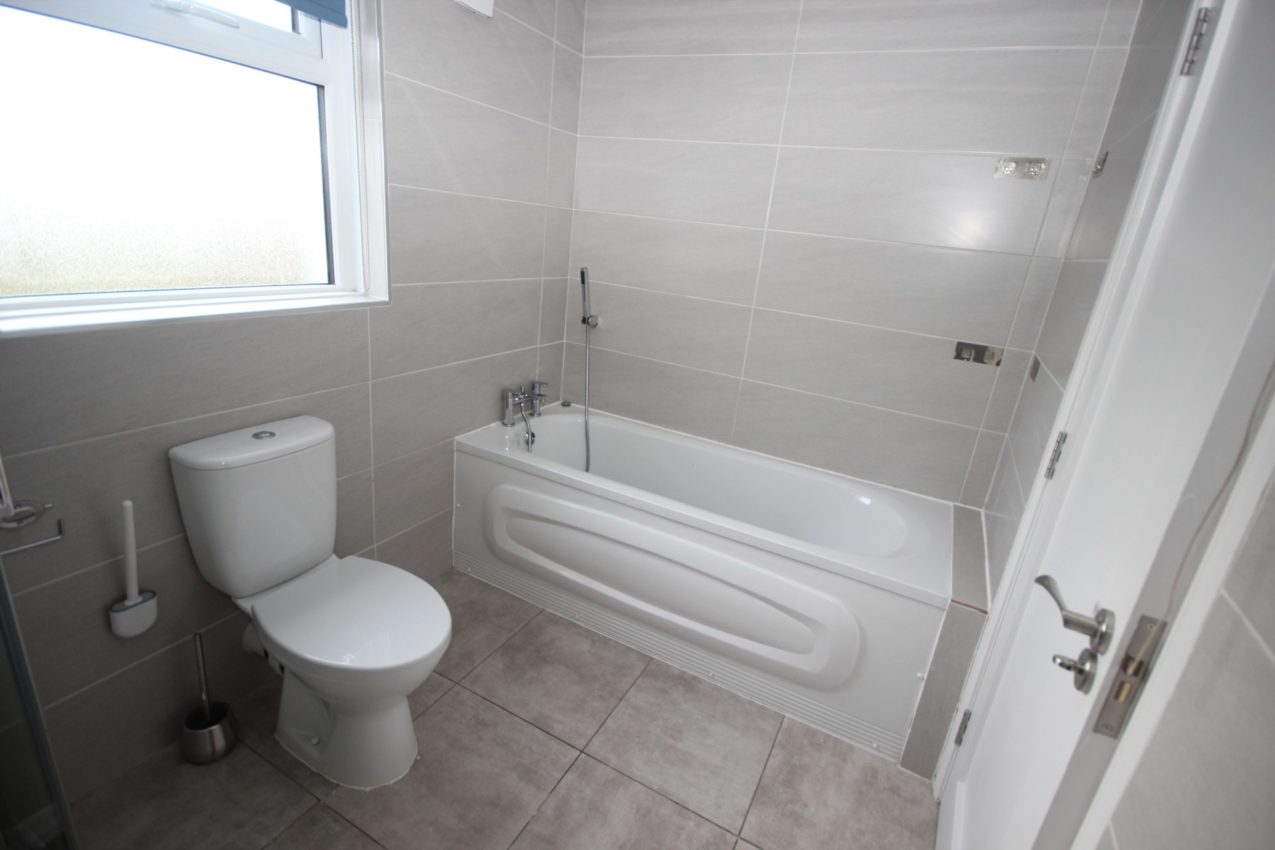Bathroom; recently upgraded & fitted with a white three-piece suite including bath with telephone mixer taps and separate fully tiled shower enclosure with Triton electric shower, fully tiled walls & tiled flooring, Grohe-style ceiling finish, shaving socket