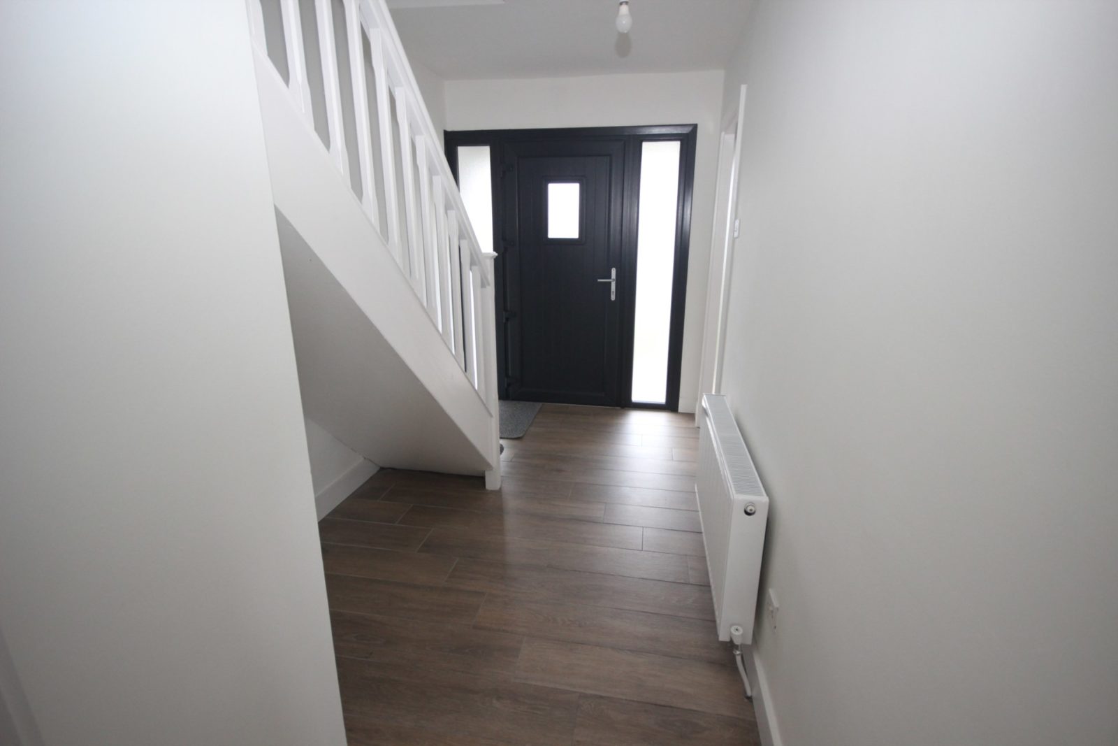 Entrance Hallway; wood-effect tiled flooring, open under-stair recess, door to;