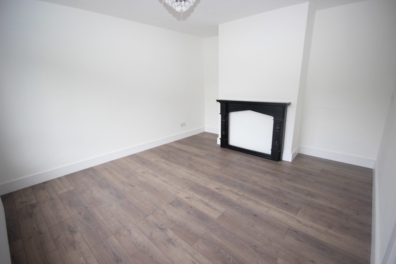 Living Room; white plank laminated flooring, closed-up fireplace, TV point