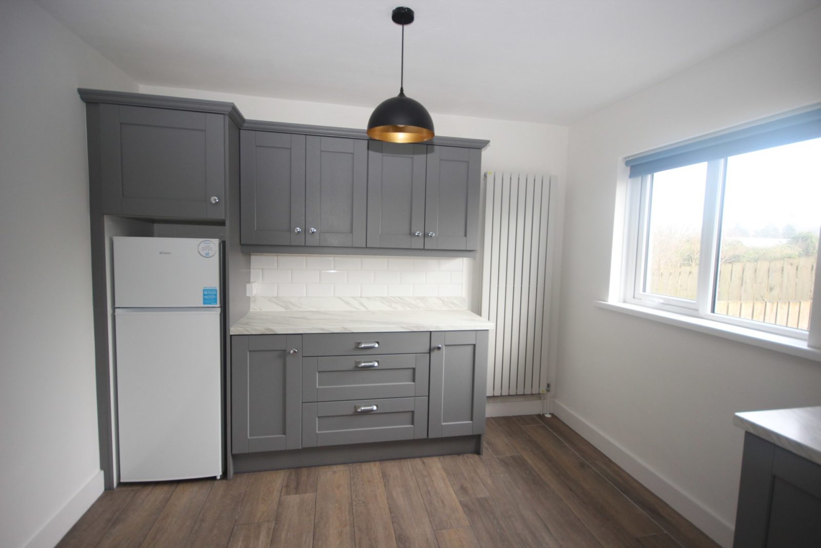 Kitchen / Dinette; Recently fitted & comprehensively equipped with coloured wall & base units, work surfaces with tiled splashbacks, stainless steel sink, electric cooker point, plumbed for dishwasher, integrated fridge/freezer, vertical radiator, wood-effect tiled flooring, door to;