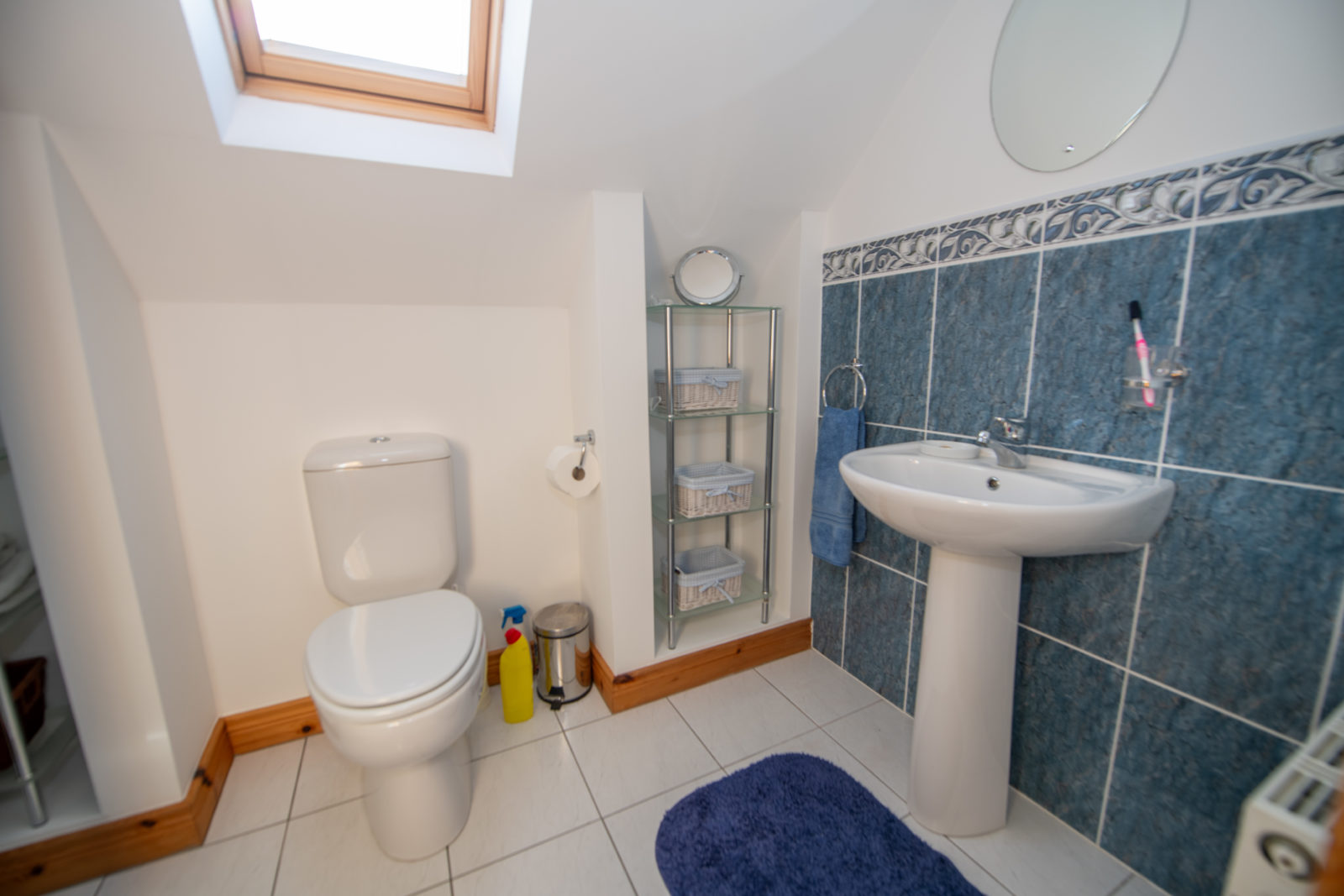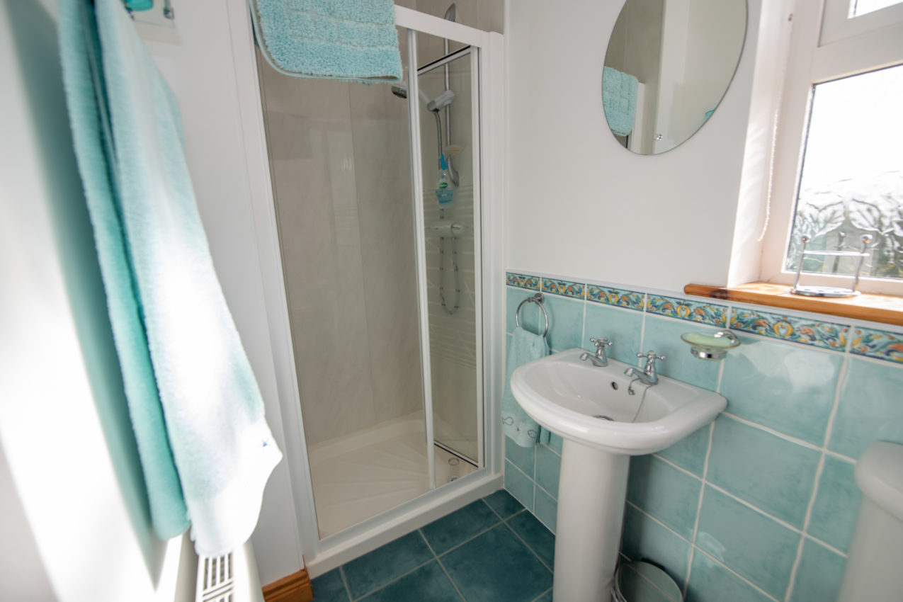 En-suite; 2.50m x 1.63m white two-piece suite with a separate fully tiled shower enclosure and Aqualisa shower, half-tiled walls & tiled flooring, fitted mirror, velux window.
