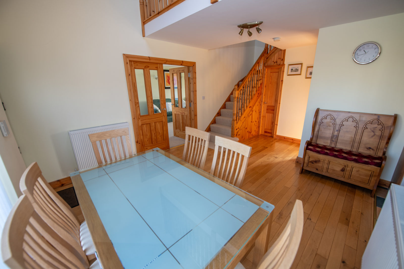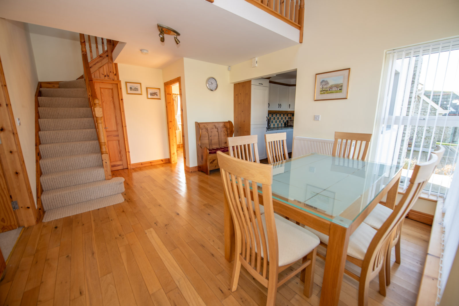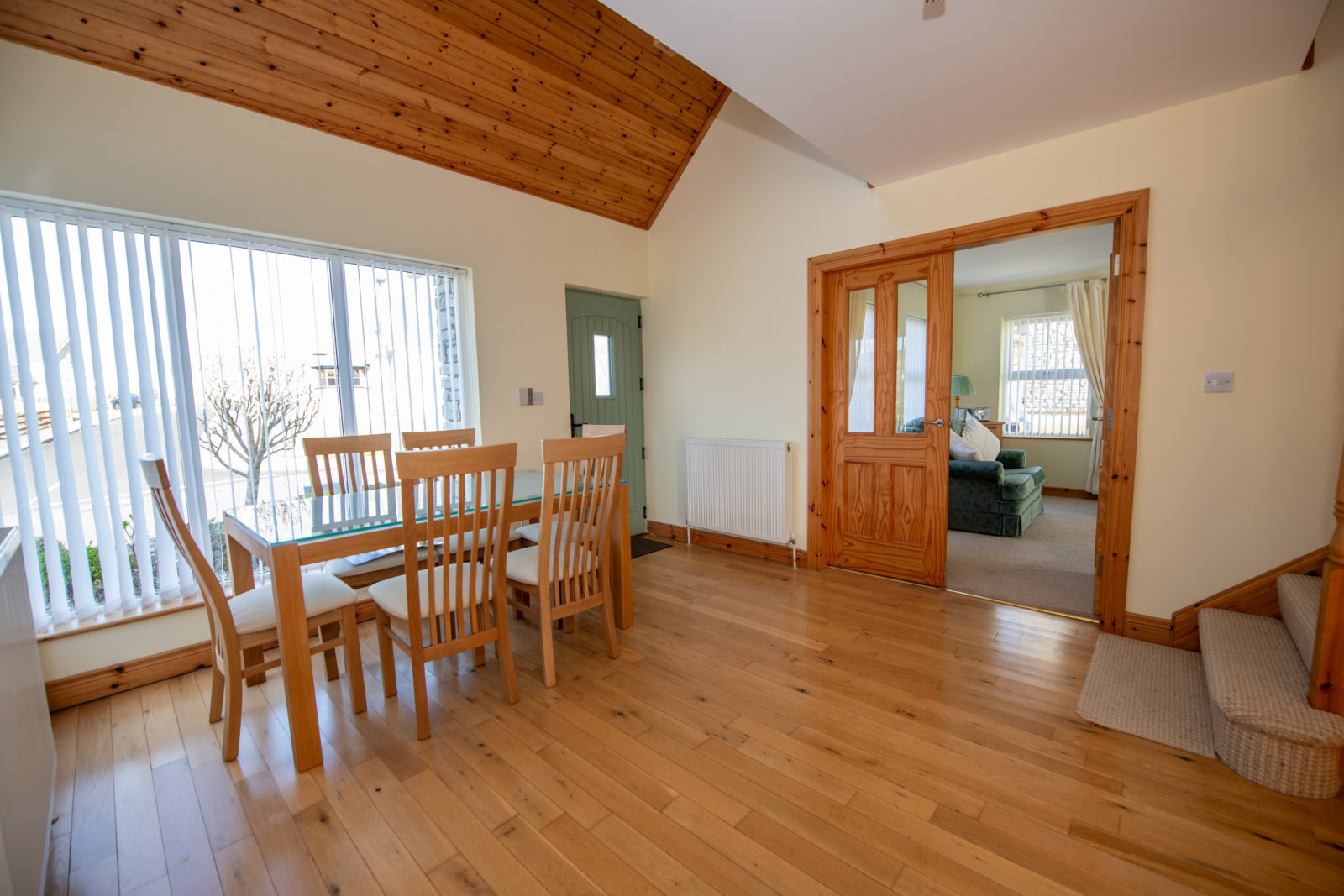 Reception/Dining Area; 3.59m x 5.03m solid oak timber flooring, a striking double ceiling height with twin velux windows to the first floor, flooding the space with natural light, door to a built-in under-stair recess