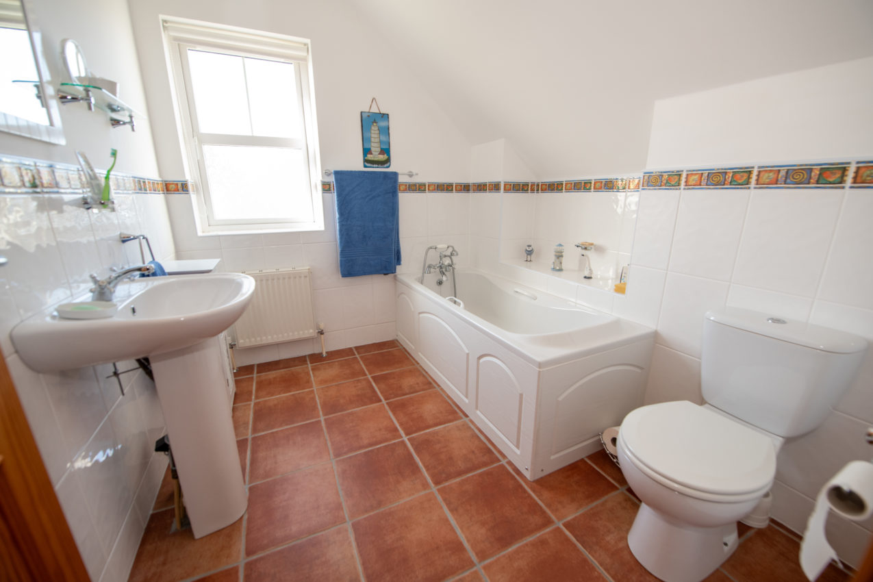 Family Bathroom; 2.52m x 2.36m white three-piece suite, half-tiled walls & tiled flooring