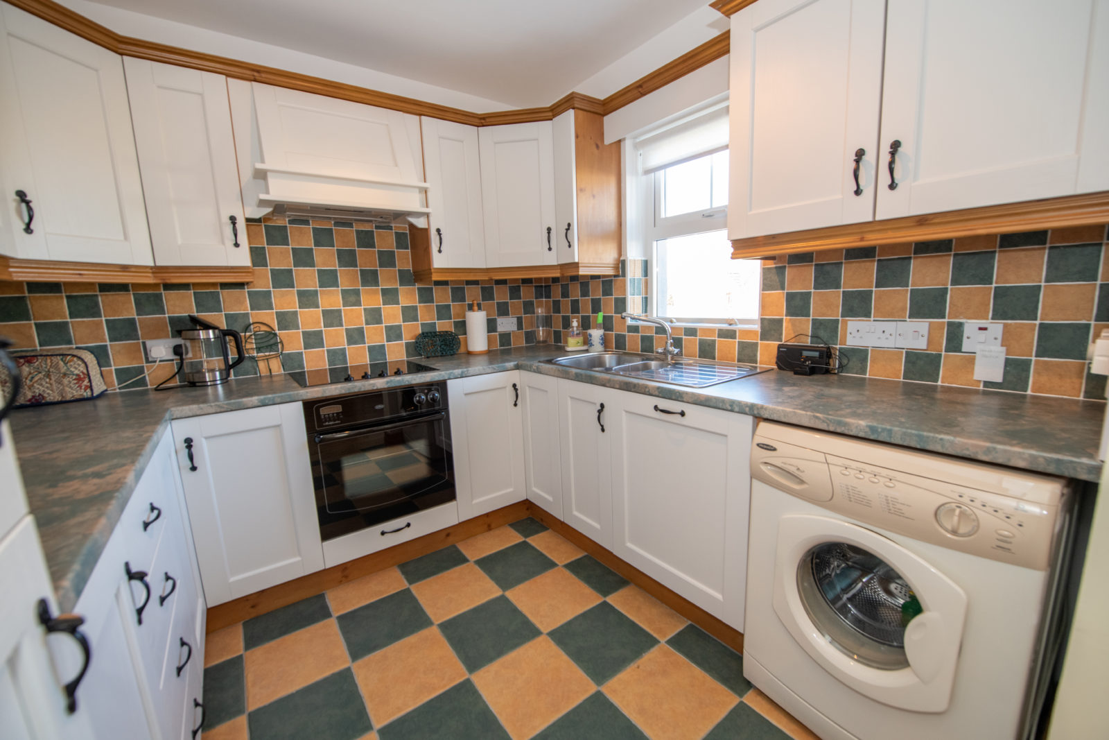 Kitchen; 2.52m x 2.58m comprehensively fitted with painted wall & base units, work surfaces with tiled surrounding walls, stainless steel single drainer sink unit with a separate waste bowl, 4-ring electric hob & oven with extractor hood over, integrated dishwasher & fridge/freezer, plumbed for washing machine, tiled flooring
