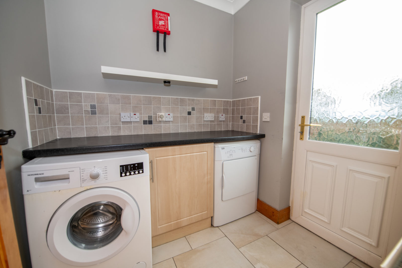 Utility Room; 1.88m x 1.78m work surfaces with tiled surrounding wall, plumbed for washing machine & wired for tumble dryer, tiled flooring, half glazed white PVC door to outside