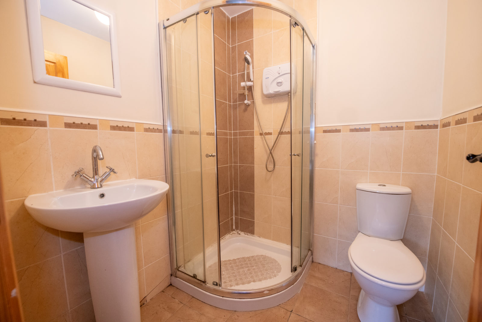 En-Suite; 1.75m x 1.74m white 2 piece suite with separate fully tiled shower enclosure with electric Triton T90 shower, half tiled walls & tiled flooring