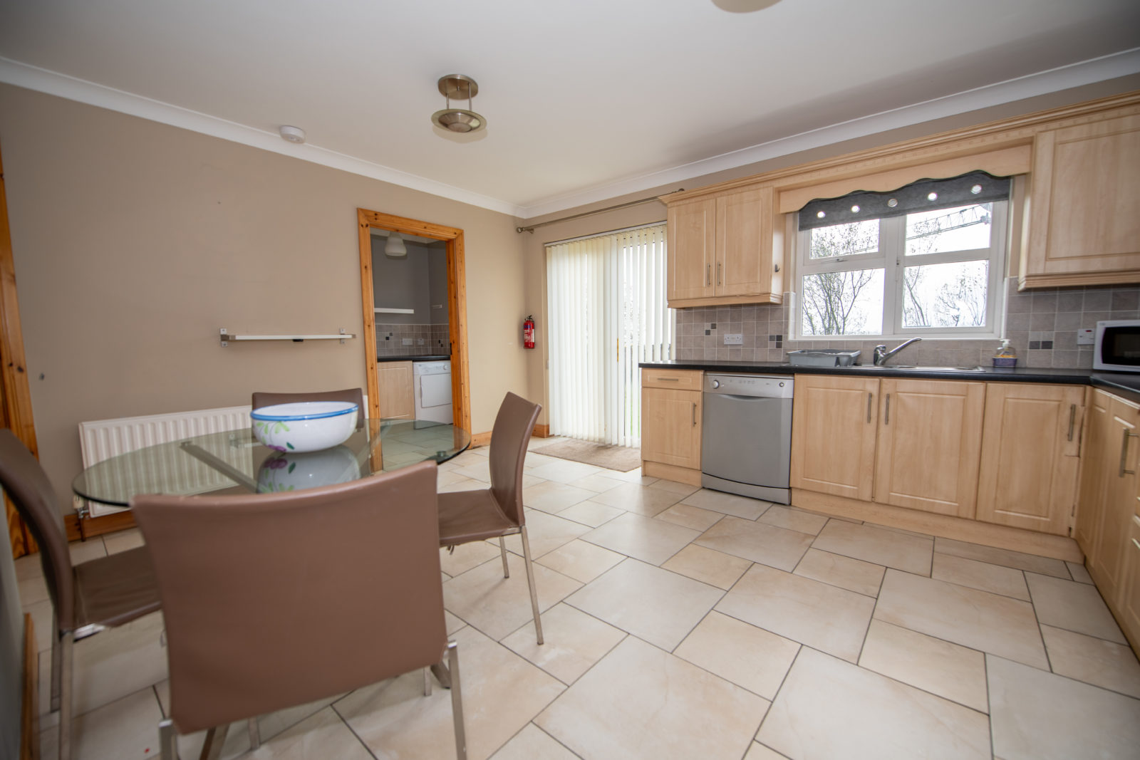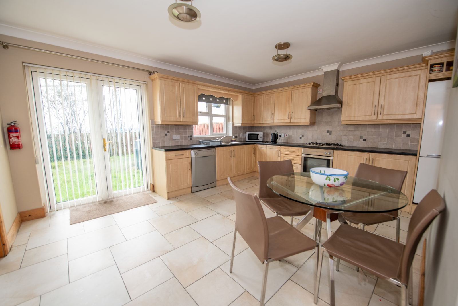 Kitchen/Dinette; 4.19m x 4.80m comprehensively equipped with maple effect wall & base units, work surfaces with tiled surrounding walls, gas hob & electric oven with stainless steel extractor canopy over, stainless steel single sink unit with separate waste bowl, tiled flooring, cornice in the ceiling, double fully glazed white PVC doors to outside, door to;