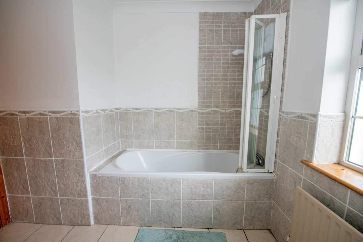 Family Bathroom; 2.78m x 2.78m white three-piece suite with a shower over bath, half tiled walls & tiled floor