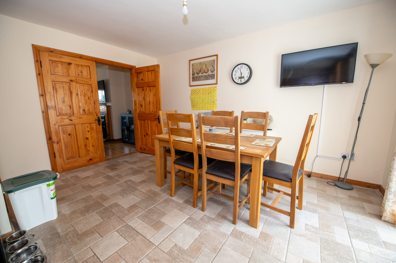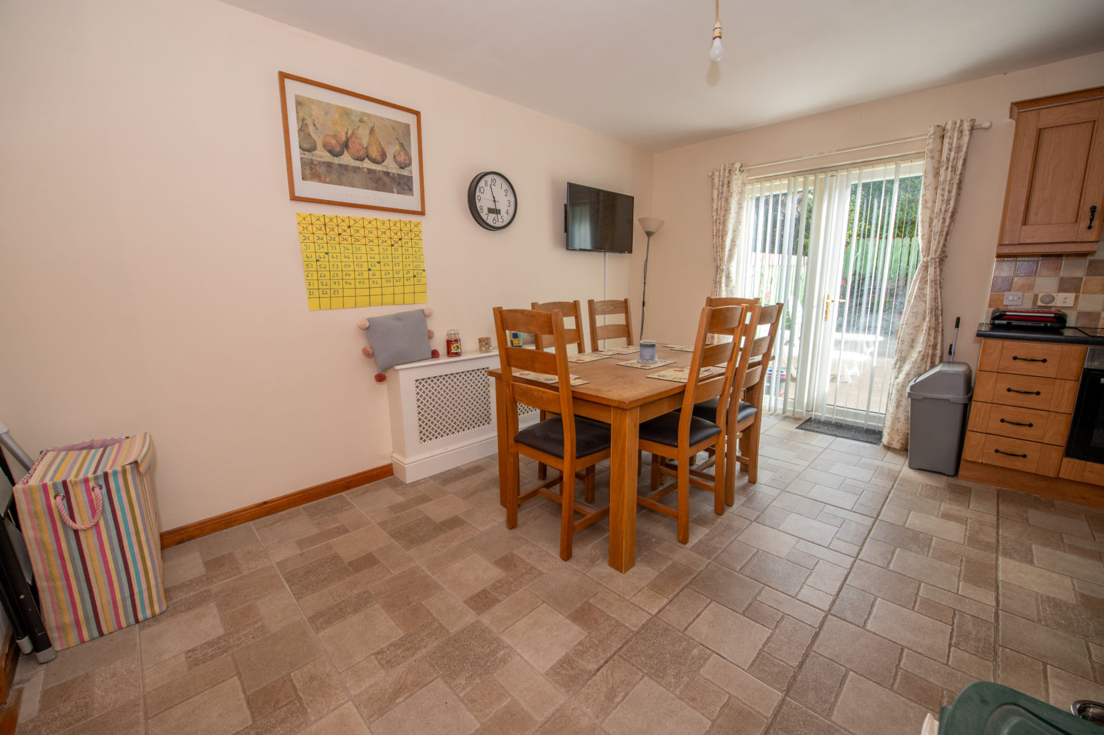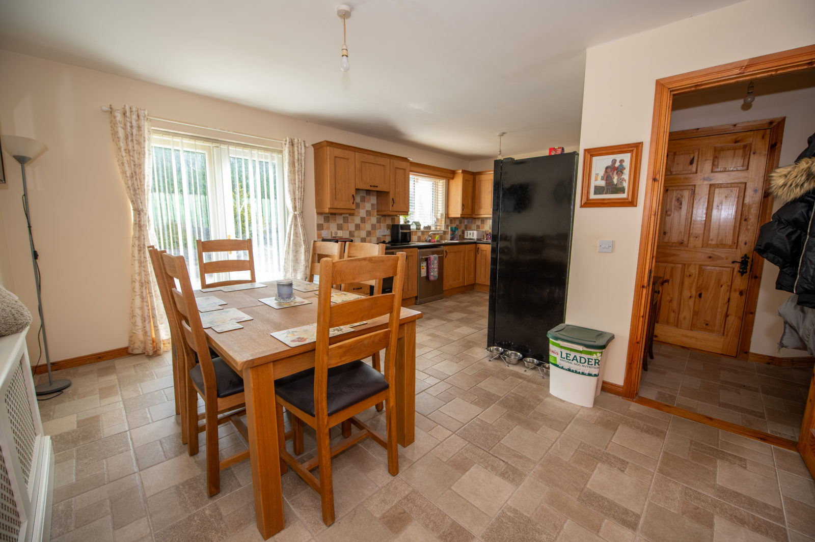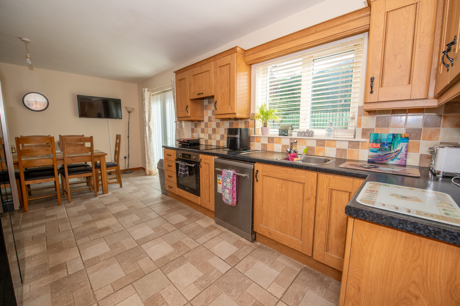 Kitchen / Dinette; 6.03m x 4.46m comprehensively equipped with Oak effect wall & base units, work surfaces with tiled surrounding walls, stainless steel single drainer sink unit, four ring electric hob & oven with extractor hood over, tiled floor, plumbed for dishwasher, TV point, double fully glazed PVC doors to outside, door to;