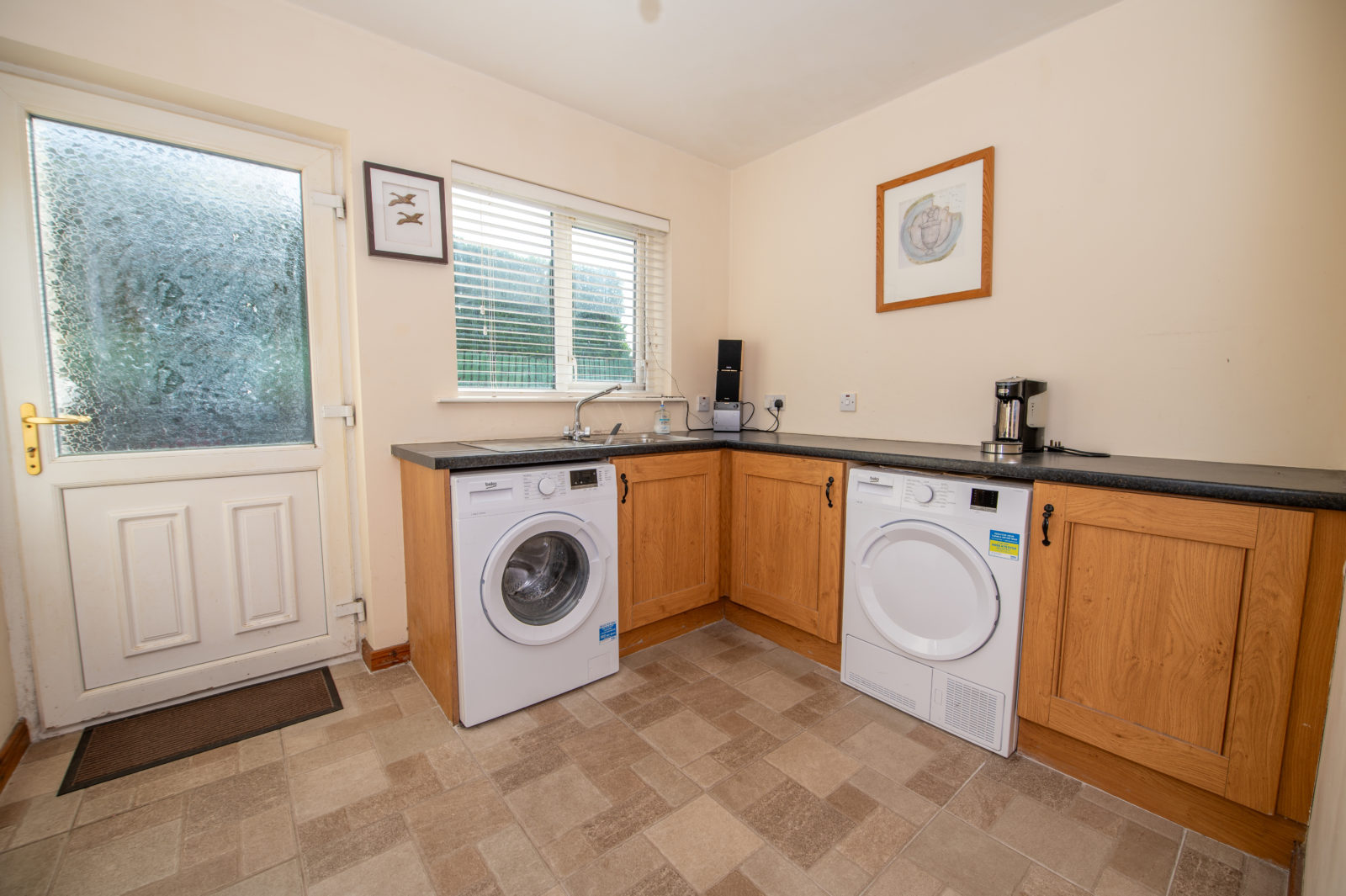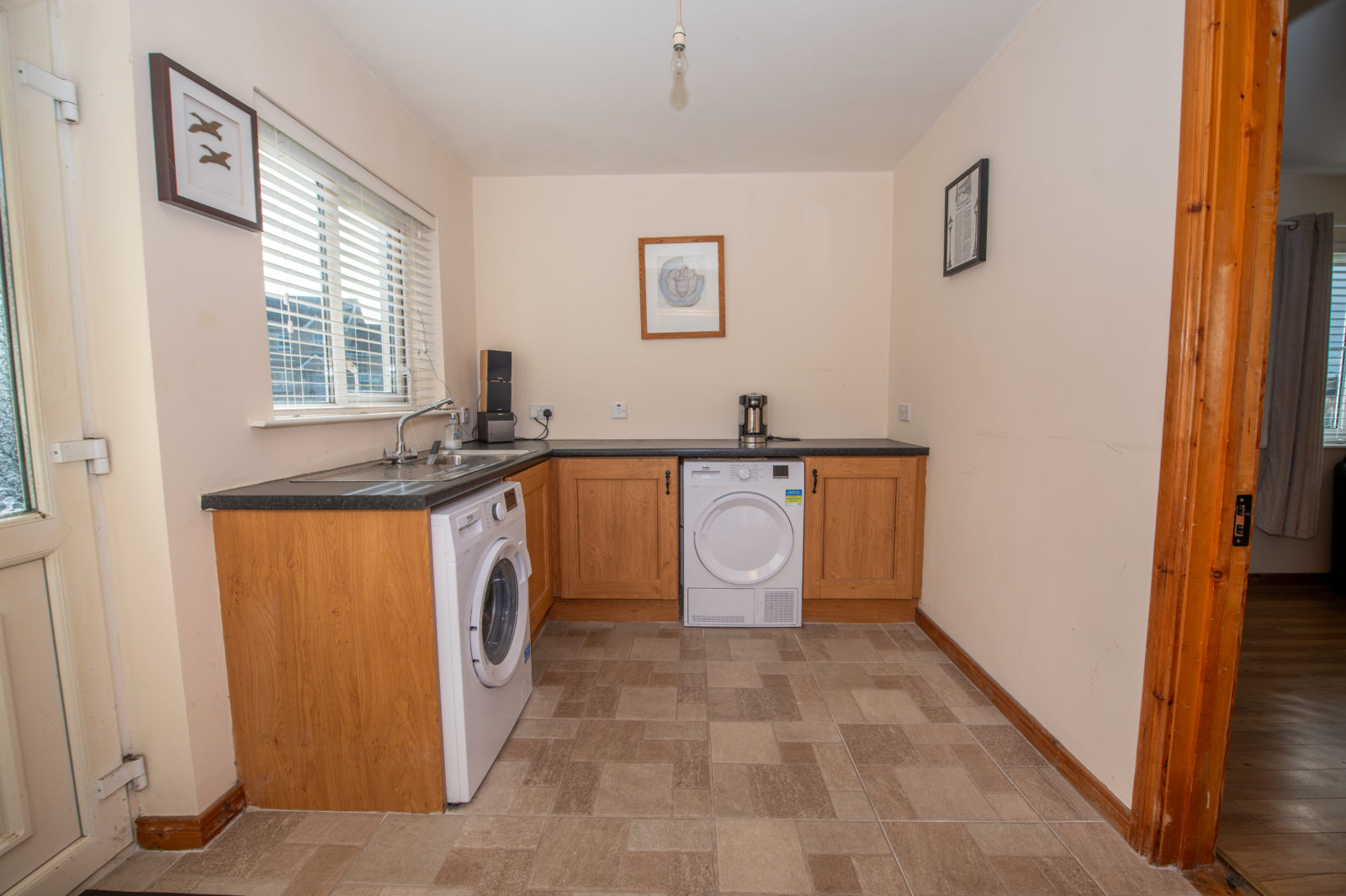 Utility Room; 2.98m x 2.42m matching range of Oak effect base units, work surfaces, stainless steel single drainer sink unit, plumbed for washing machine & wired for tumble dryer, tiled floor, half glazed white PVC door to outside, plus further door to;