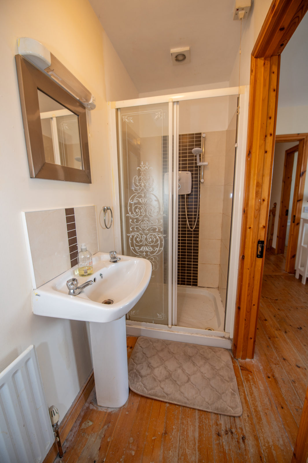 En suite; 2.79m x 1.00m white 2 piece suite with separate fully tiled shower enclosure with electric Triton T90sr shower, tiled splashback to the wash hand basin, shaver light & socket, chrome fittings, pine wooden floor