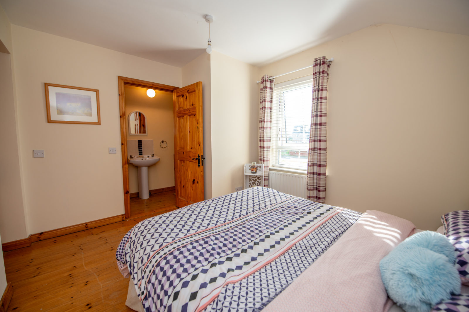 Ensuite; 2.98m x 1.89m white 2 piece suite with separate fully tiled shower enclosure with electric Triton shower, tiled splashback to the wash hand basin, pine flooring