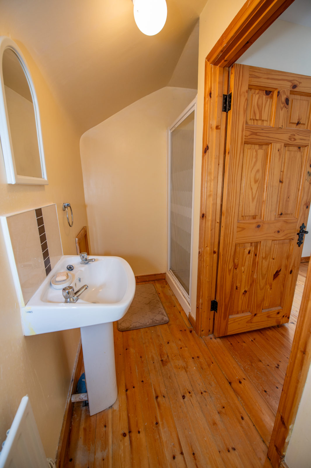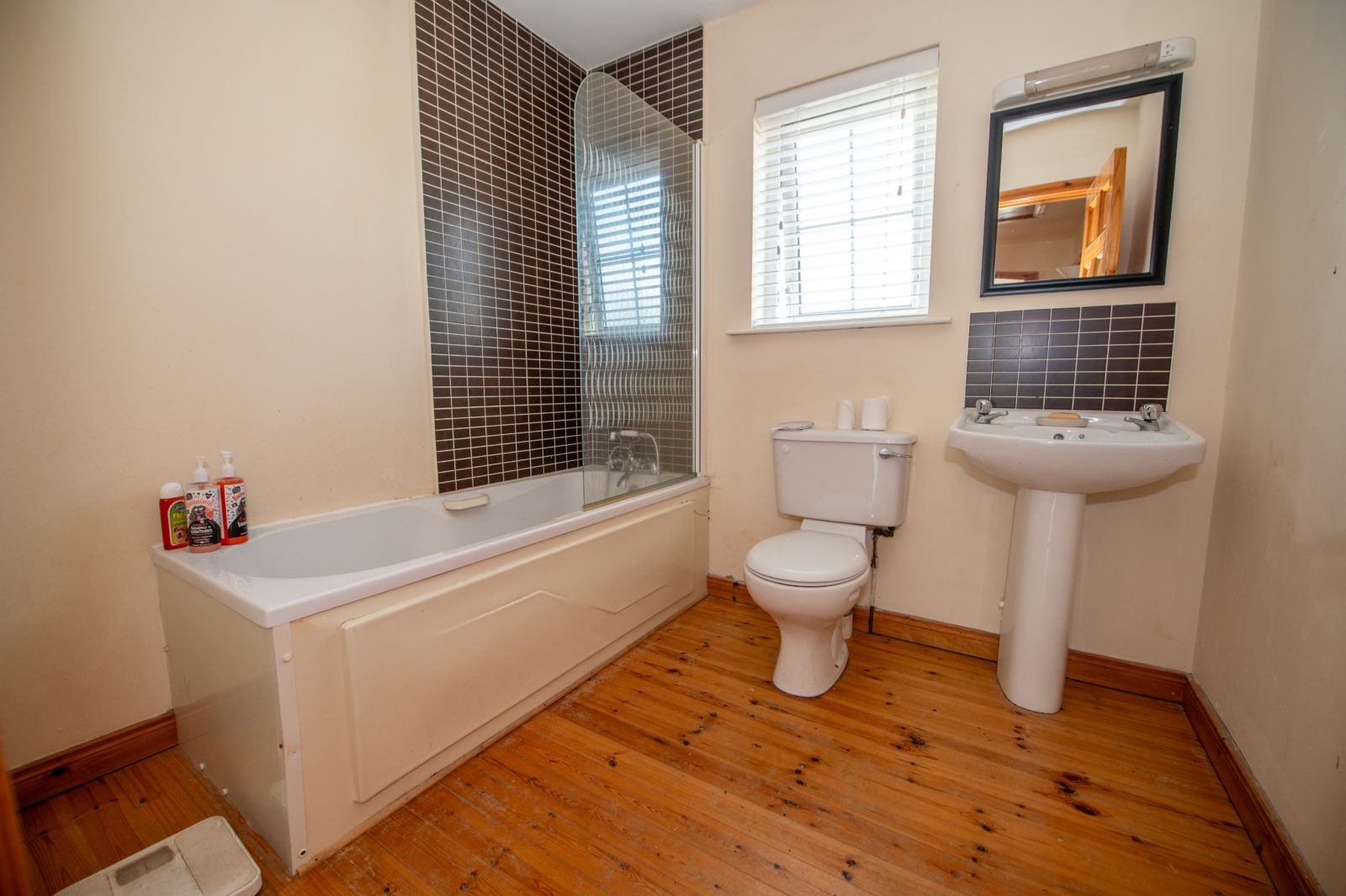Family Bathroom; 2.33m x 2.05m white 3 piece suite with telephone mixer taps over bath, shower screen, tiled splashback to wash hand basin, pine wooden floor, shaver light & socket
