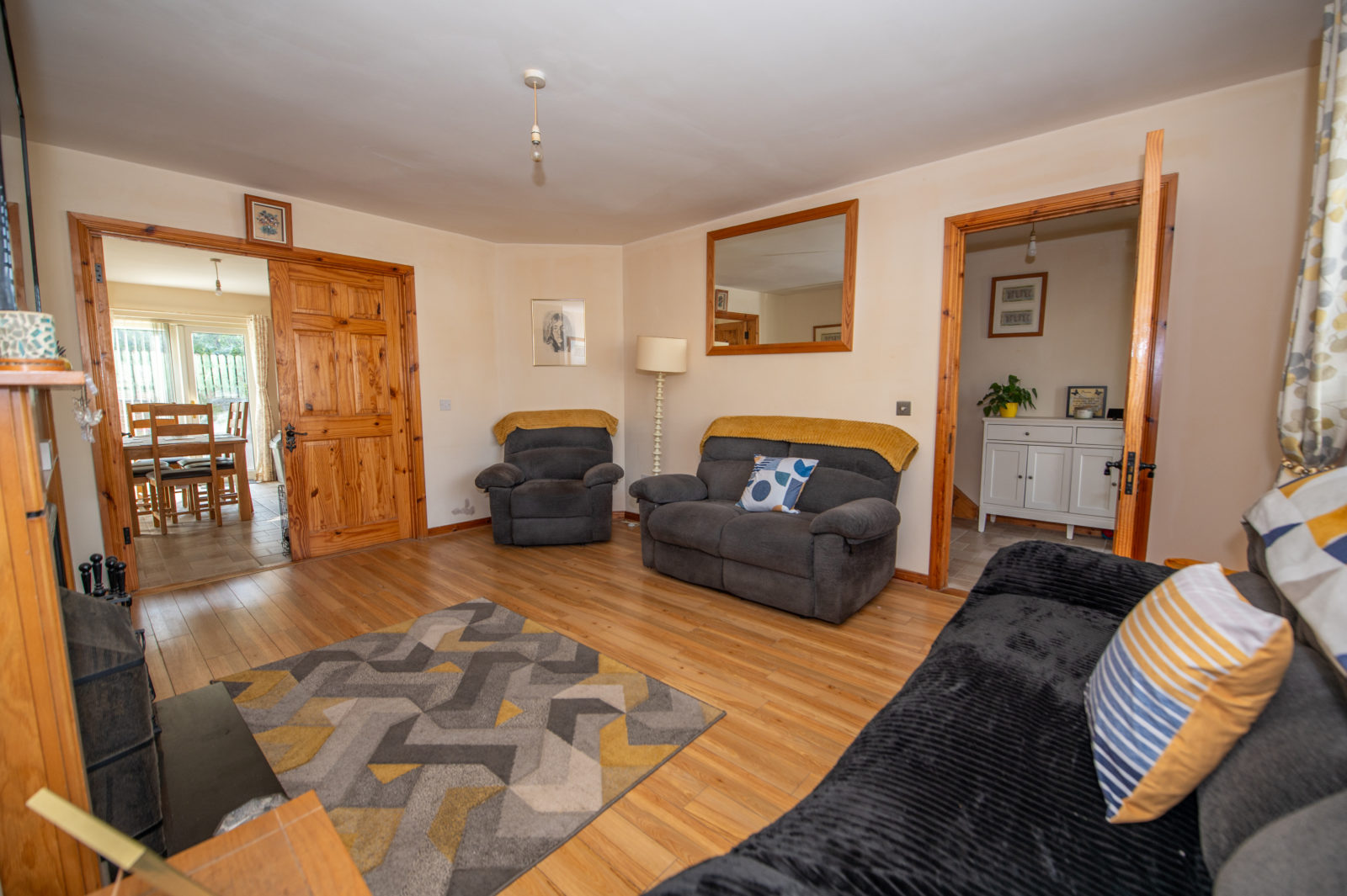 Living Room; 3.94m x 4.76m laminated wooden flooring, pine fireplace with cast-iron inset & tiled hearth, TV point, double doors to;