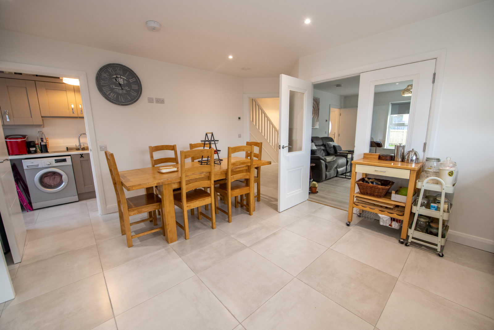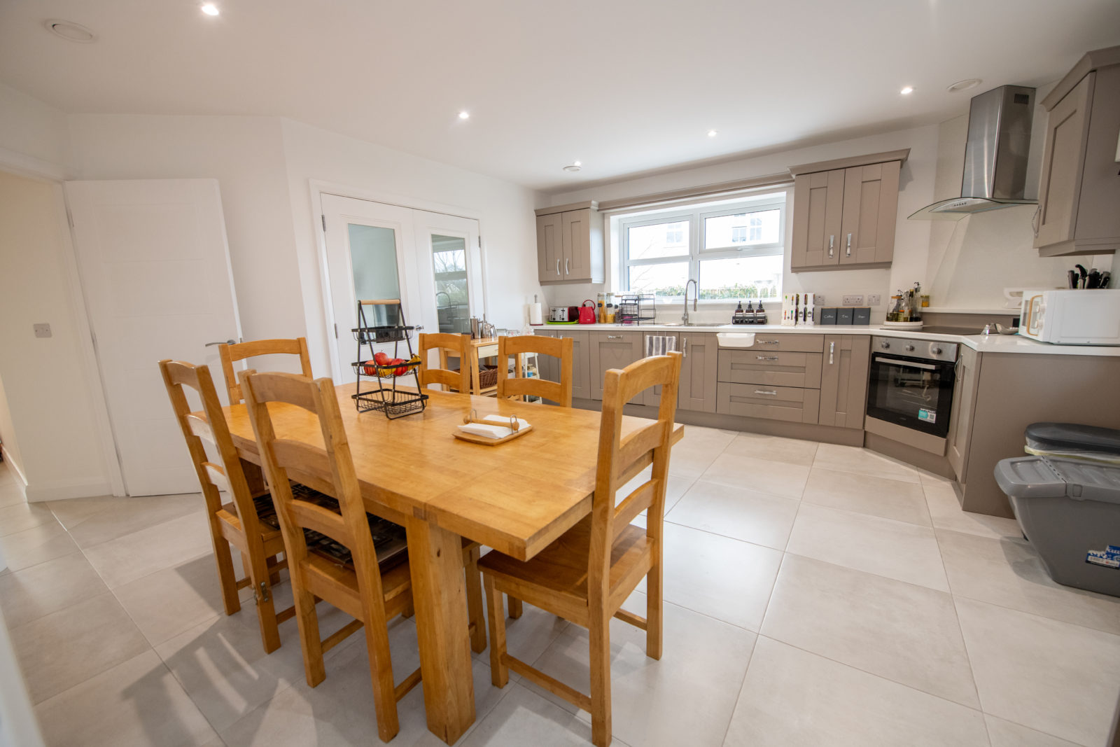 Kitchen/Dinette; 04.53m x 5.13m comprehensively equipped with a range of Shaker-style wall & base units, work surfaces with matching upstands, stainless steel single drainer sink unit with separate waste bowl, four-ring electric hob & oven with stainless steel extractor canopy overhead, integrated dishwasher, recessed lighting, tiled flooring, half-glazed double doors into;