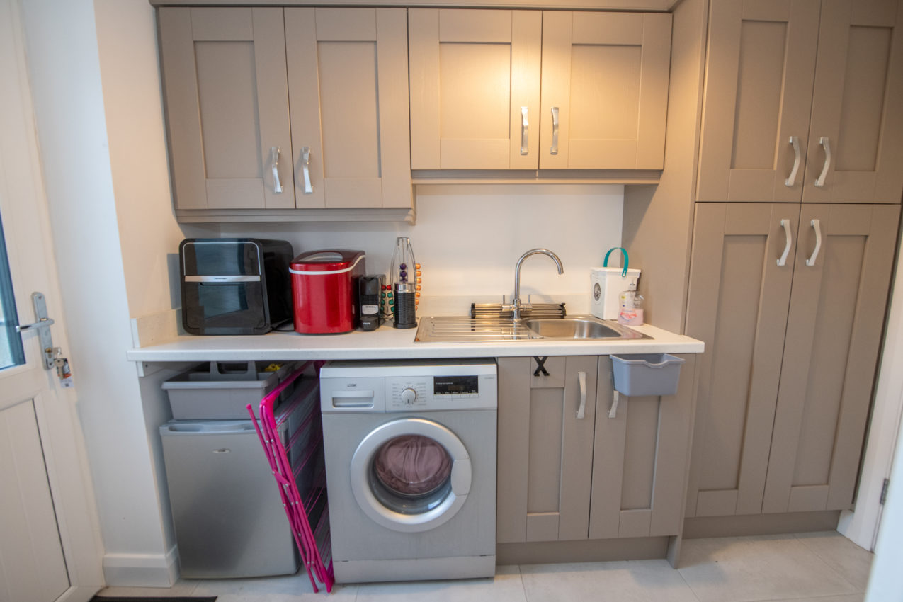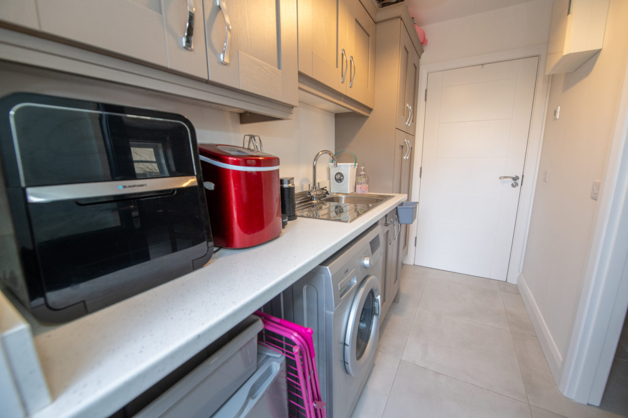 Utility Room; 1.51m x 2.63m matching range of Shaker-style wall & base units incorporating a broom cupboard, stainless steel single drainer sink unit, work surfaces with upstand, tiled flooring, half-glazed composite door to the outside, along with an additional internal door to;