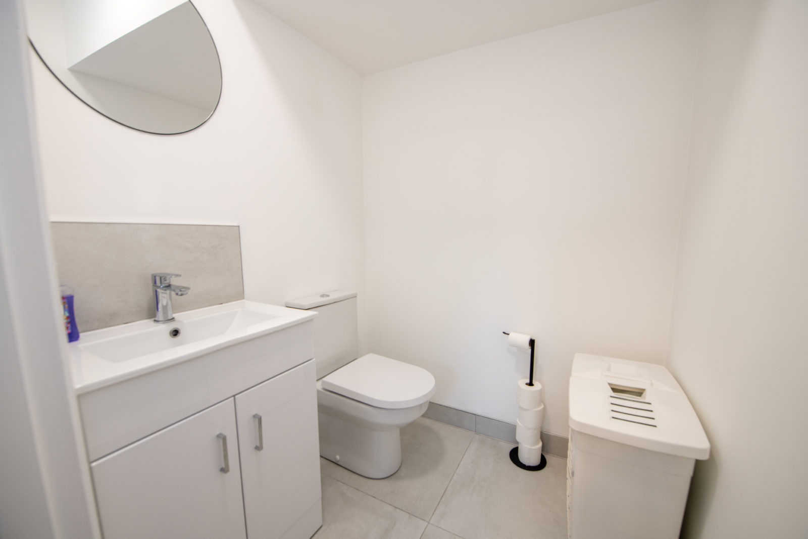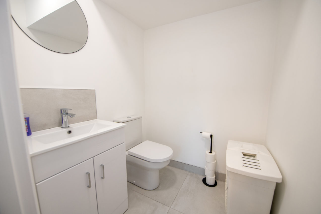WC; 1.51m x 1.48m white two-piece suite with fitted storage beneath the wash hand basin, tiled splashback, tiled flooring