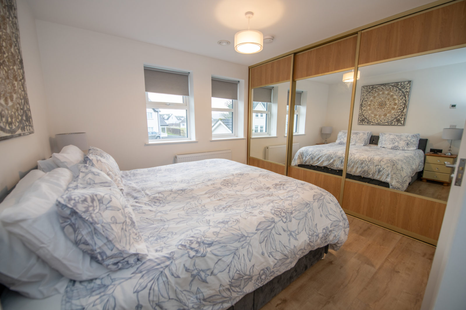 Bedroom 1; 3.73m x 3.88m (front) wide plank laminated flooring, floor-to-ceiling built-in slide robes, door to;