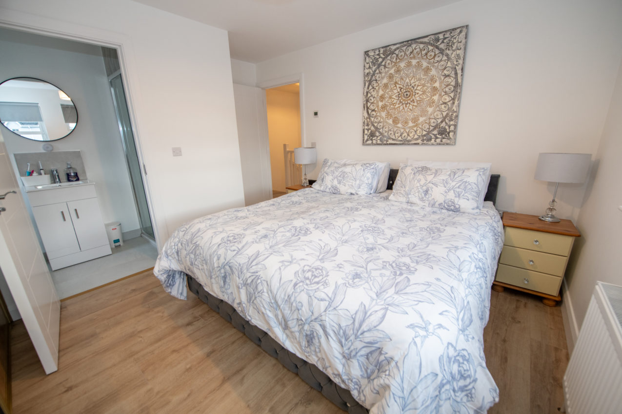 Luxury Ensuite; 2.63m x 1.00m white two-piece suite and a separate fully tiled shower enclosure with rain shower fitting, tiled splashback to the wash hand basin with fitted storage underneath, a heated chrome towel rail