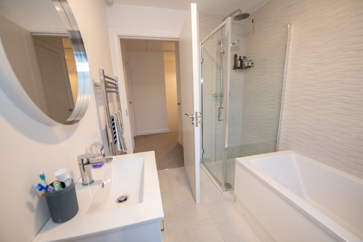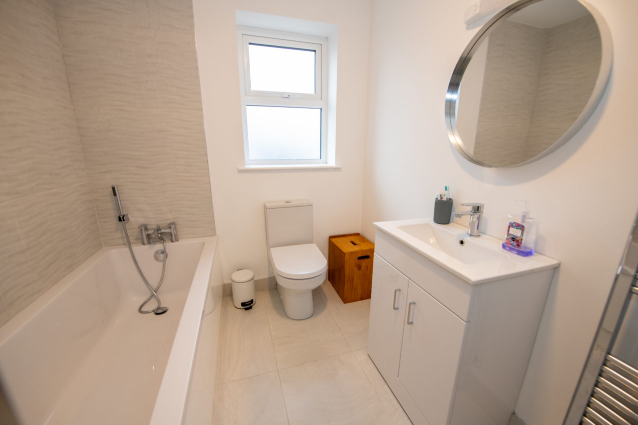 Family Bathroom; 2.63m x 1.99m white three-piece suite and a separate fully tiled shower enclosure with manual shower fittings, heated chrome towel rail, shaver light & socket, tiled flooring