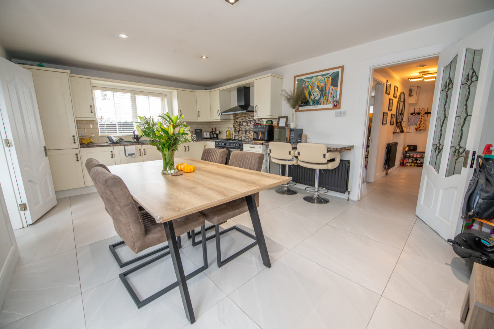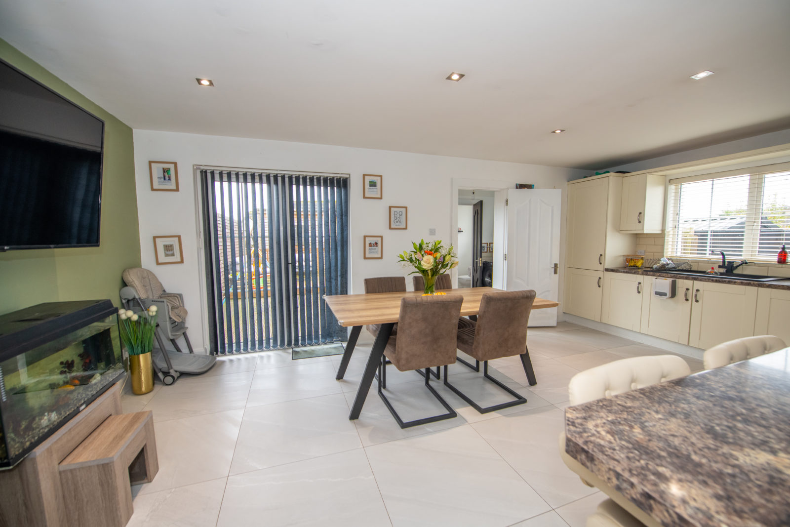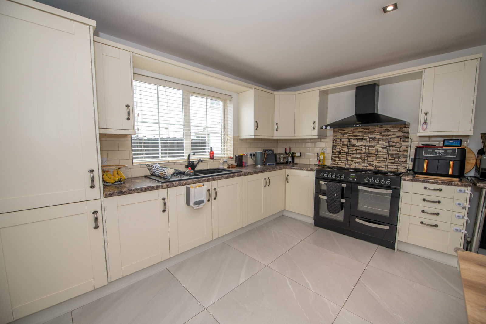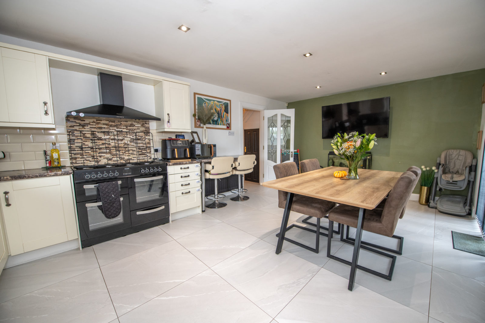 Kitchen/Dinette; 3.77m x 5.94m fully equipped with Shaker-style wall & base units, work surfaces with tiled splashbacks, ceramic single drainer sink unit with separate with waste bowl, eight-ring gas cooker with an electric oven with extractor canopy above, fitted breakfast bar, recessed lighting, TV point, tiled floor, double fully glazed white PVC doors open onto the rear decking, door to;