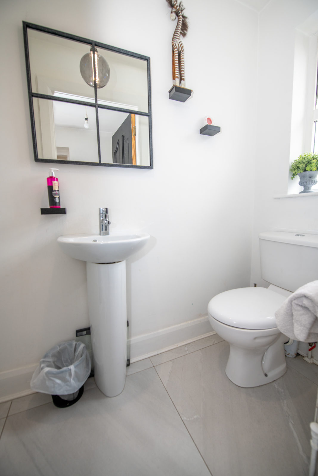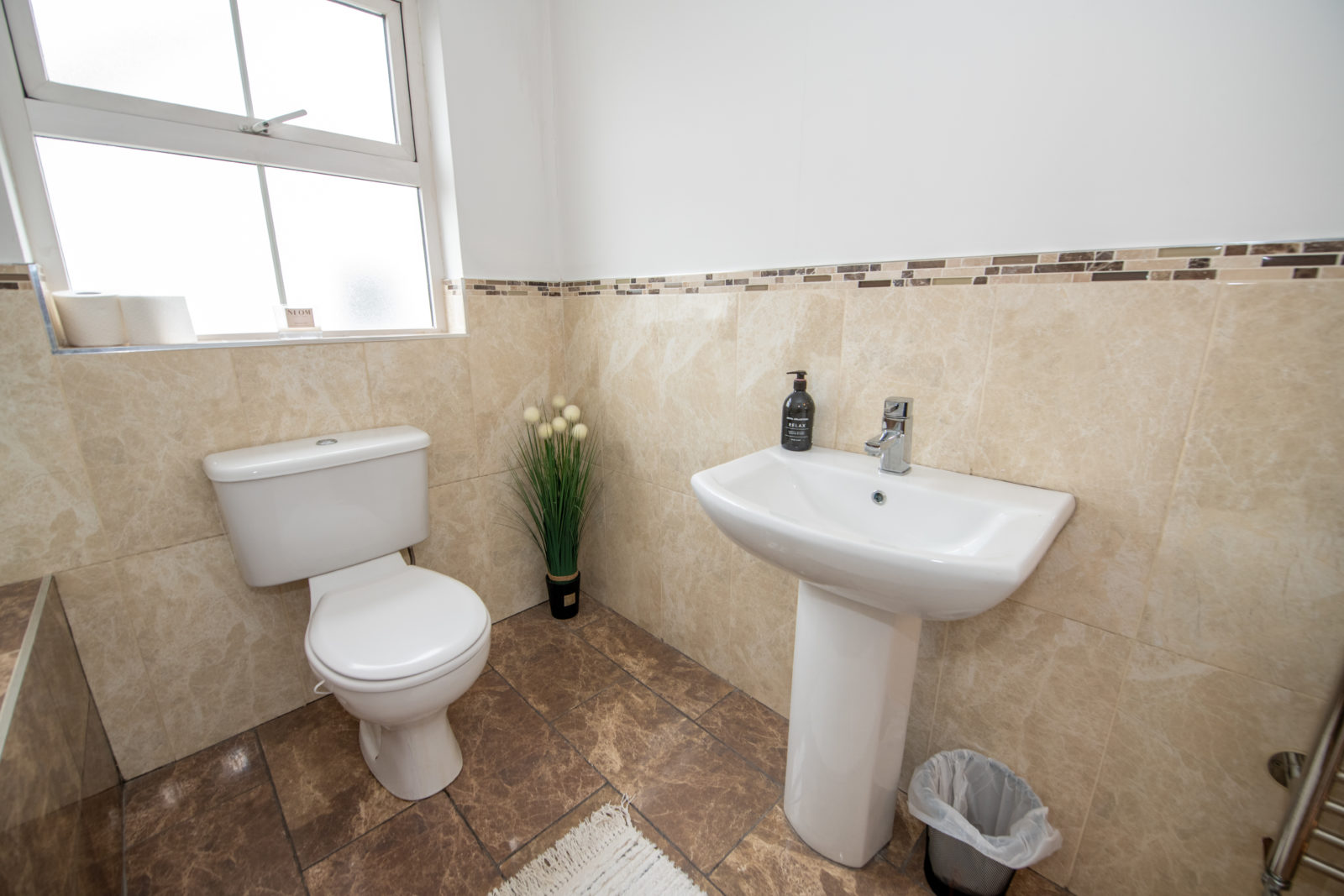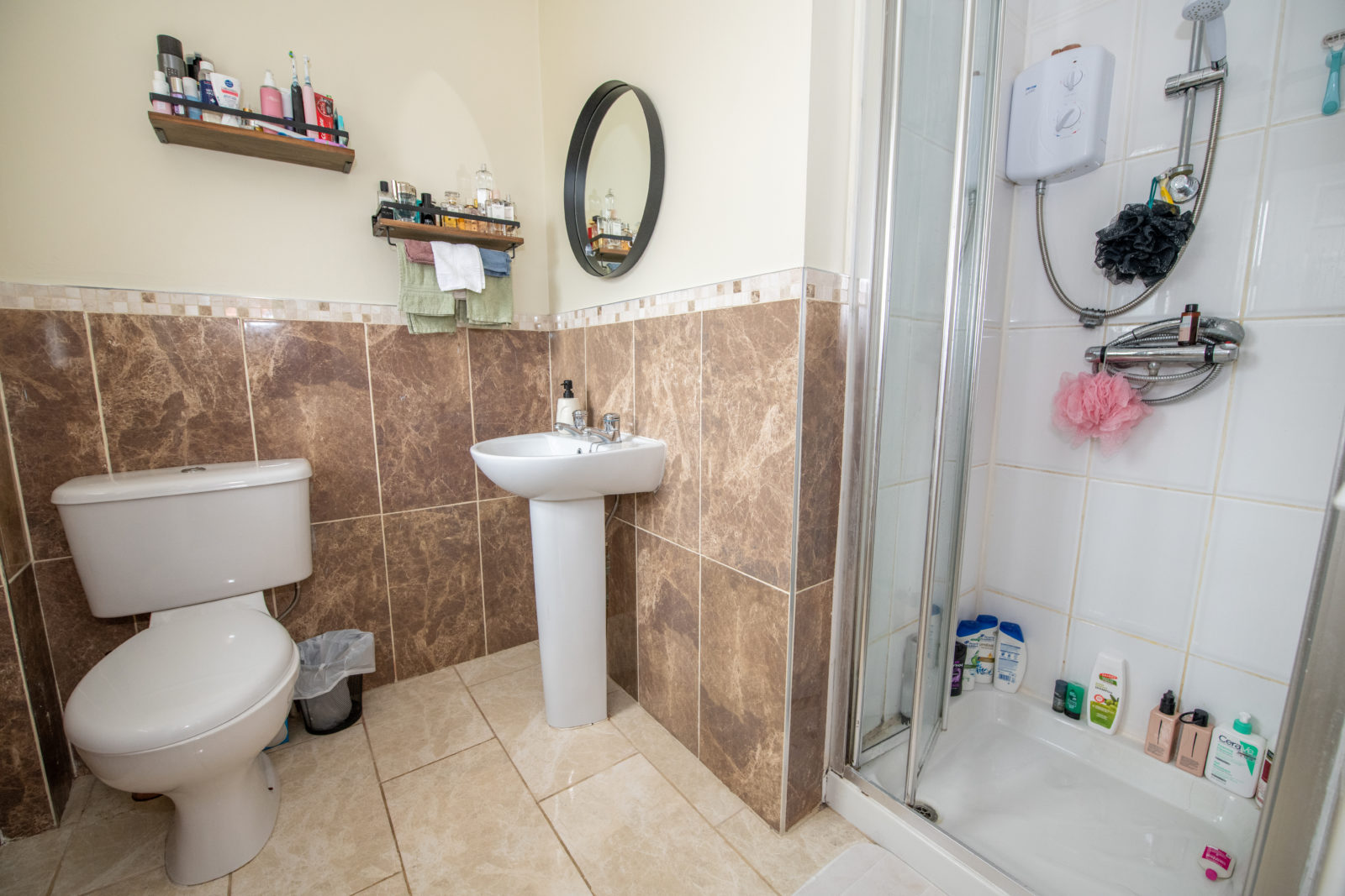 Luxury En-Suite; 2.37m x 1.95m white two-piece suite with a separate fully tiled shower enclosure with both an electric Triton shower and an additional manual shower, half-tiled walls & tiled flooring, integrated shelving