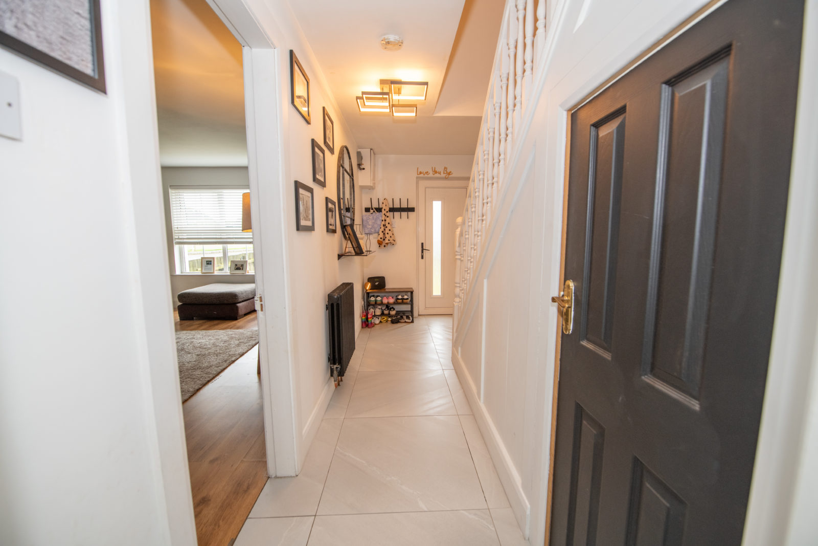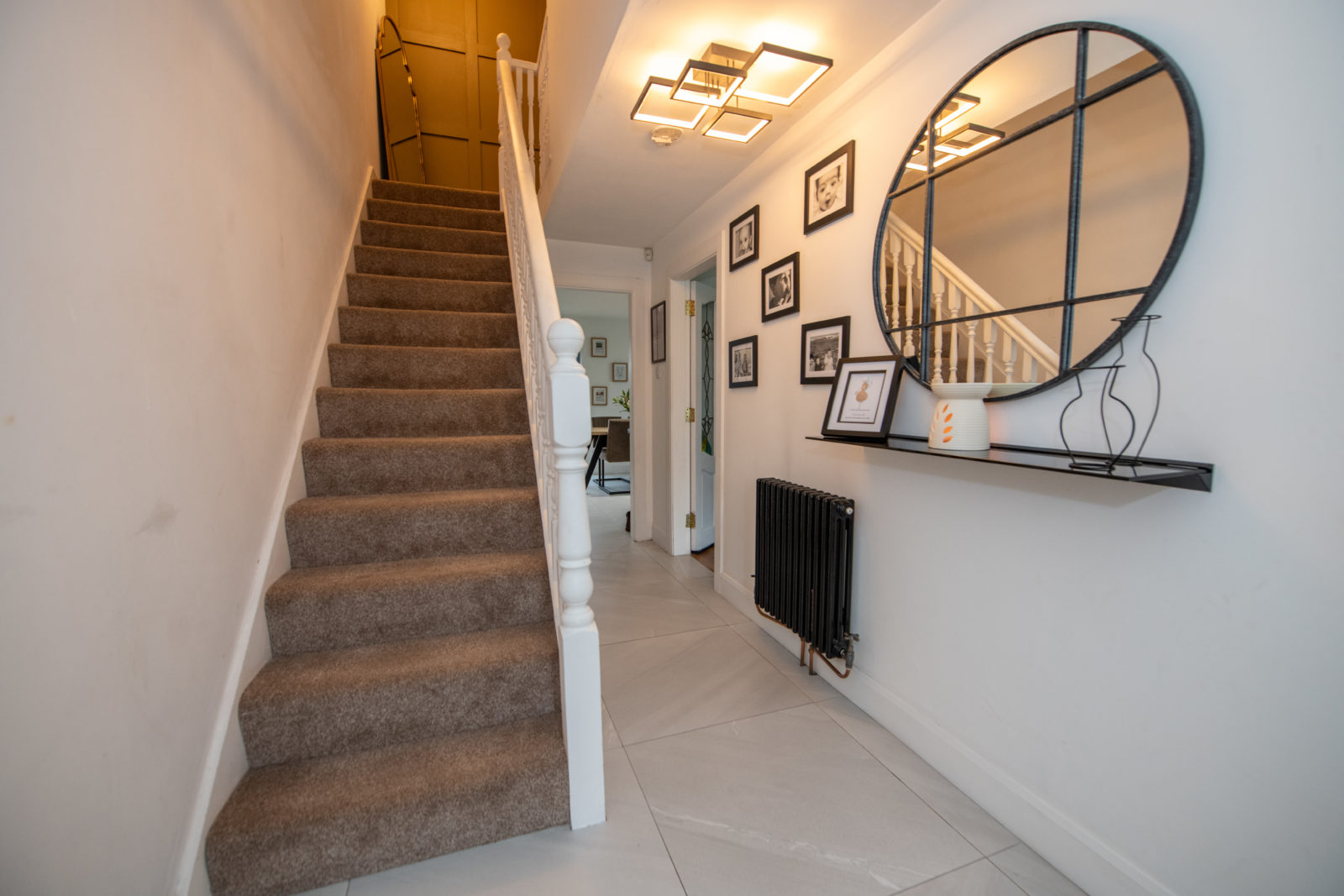 Entrance Hallway; 4.49m x 1.93m stylish tiled floor, cast-iron radiator, built-in under-stairs recess, door to: