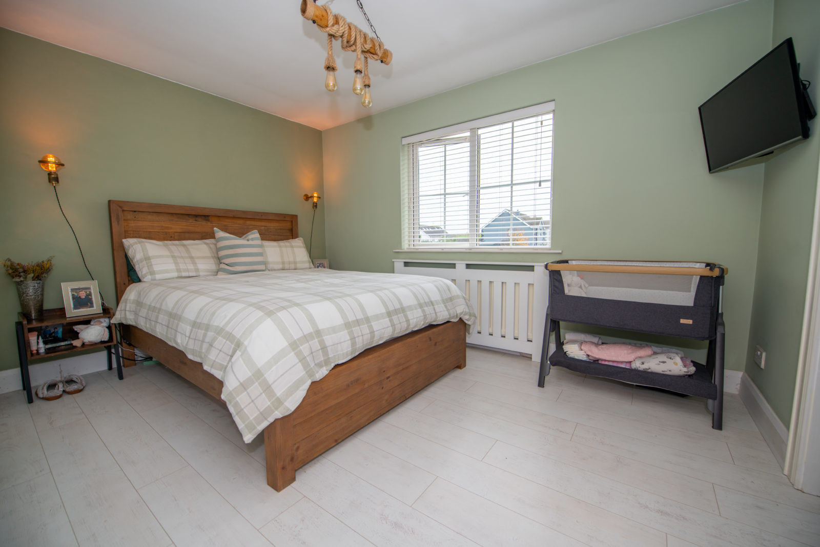 Bedroom 1; (front) 2.79m x 3.89m wide plank laminated flooring, floor-to-ceiling mirrored sliding wardrobes, radiator cover, TV point, door to;