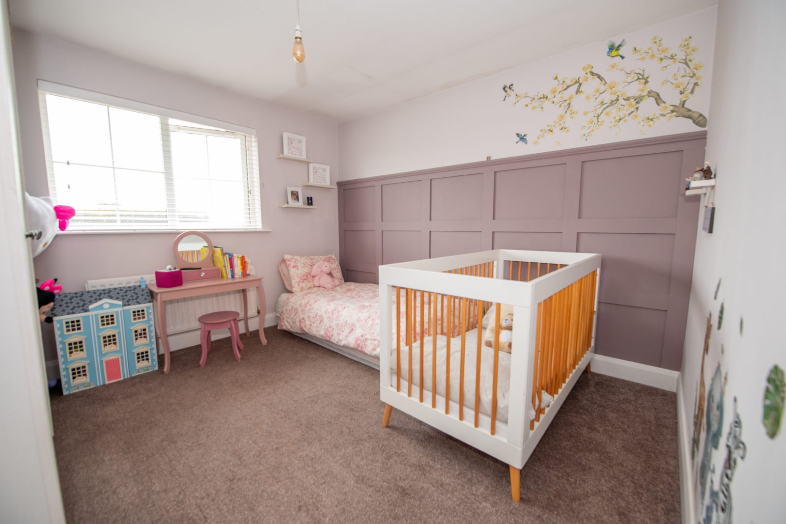 Bedroom 2; (rear) 3.37m x 3.27m carpeted flooring with charming wood panelled walls.