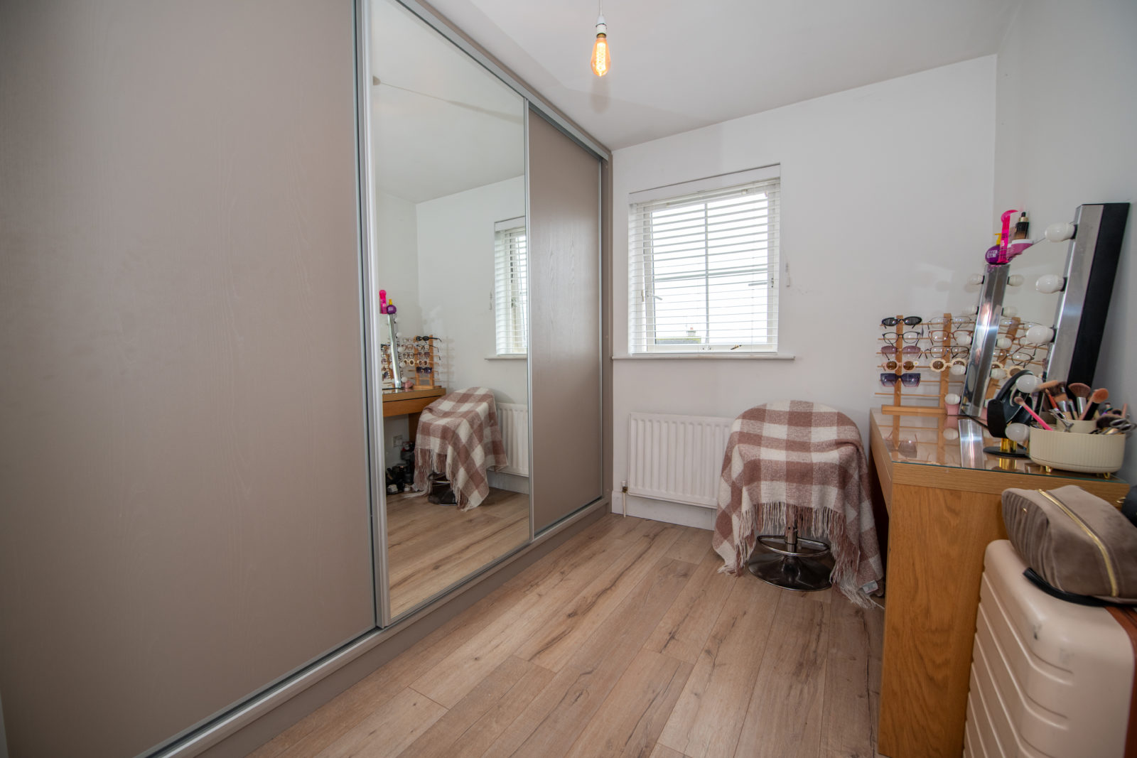 Bedroom 3; (rear) 2.66m x 2.57m wide plank laminated flooring, floor to ceiling built-in mirrored sliding wardrobes.