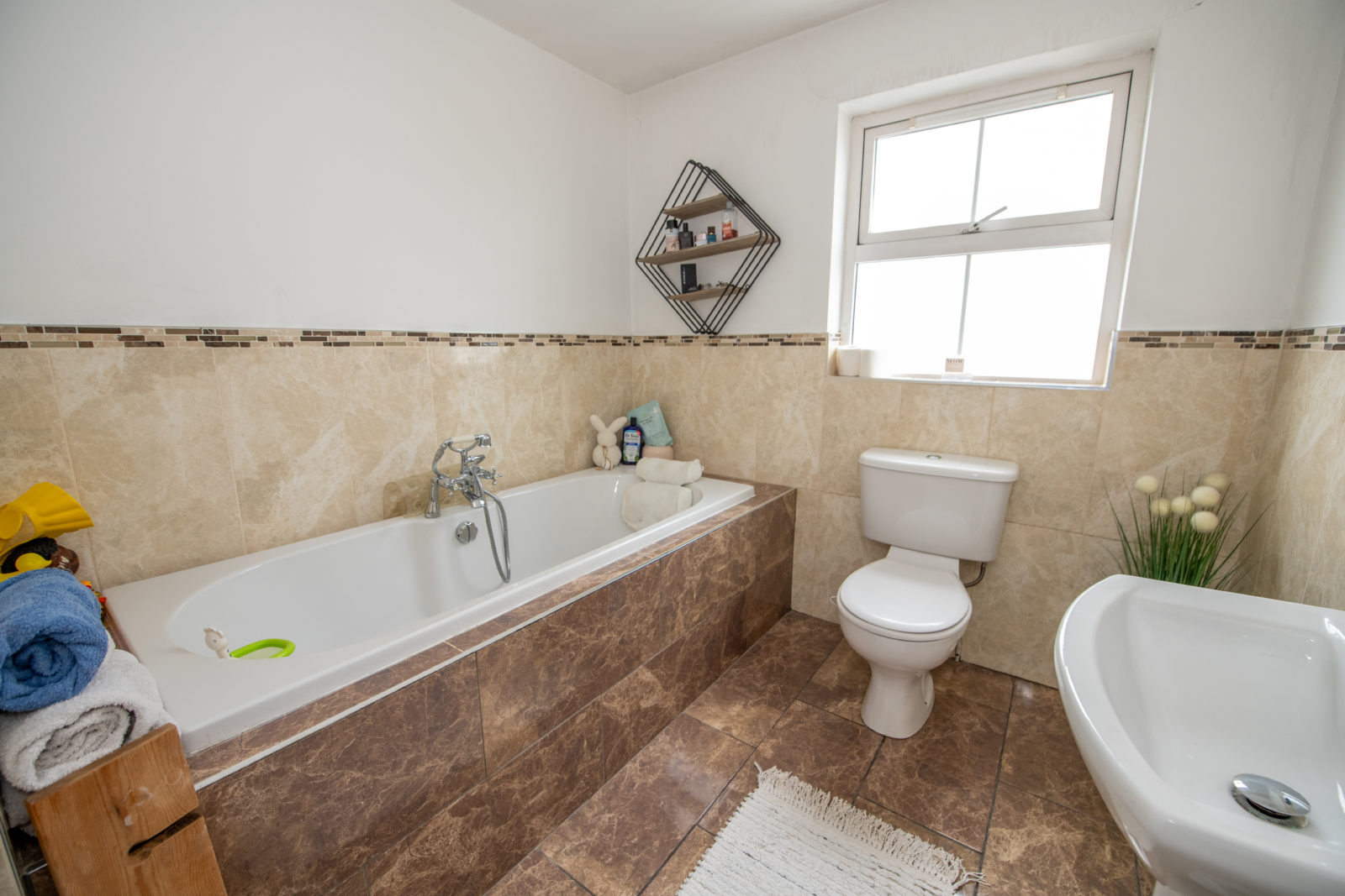 Family Bathroom; 2.31m x 2.63m white three-piece suite including telephone-style mixer taps over the bath, half-tiled walls & tiled flooring, chrome heated towel rail