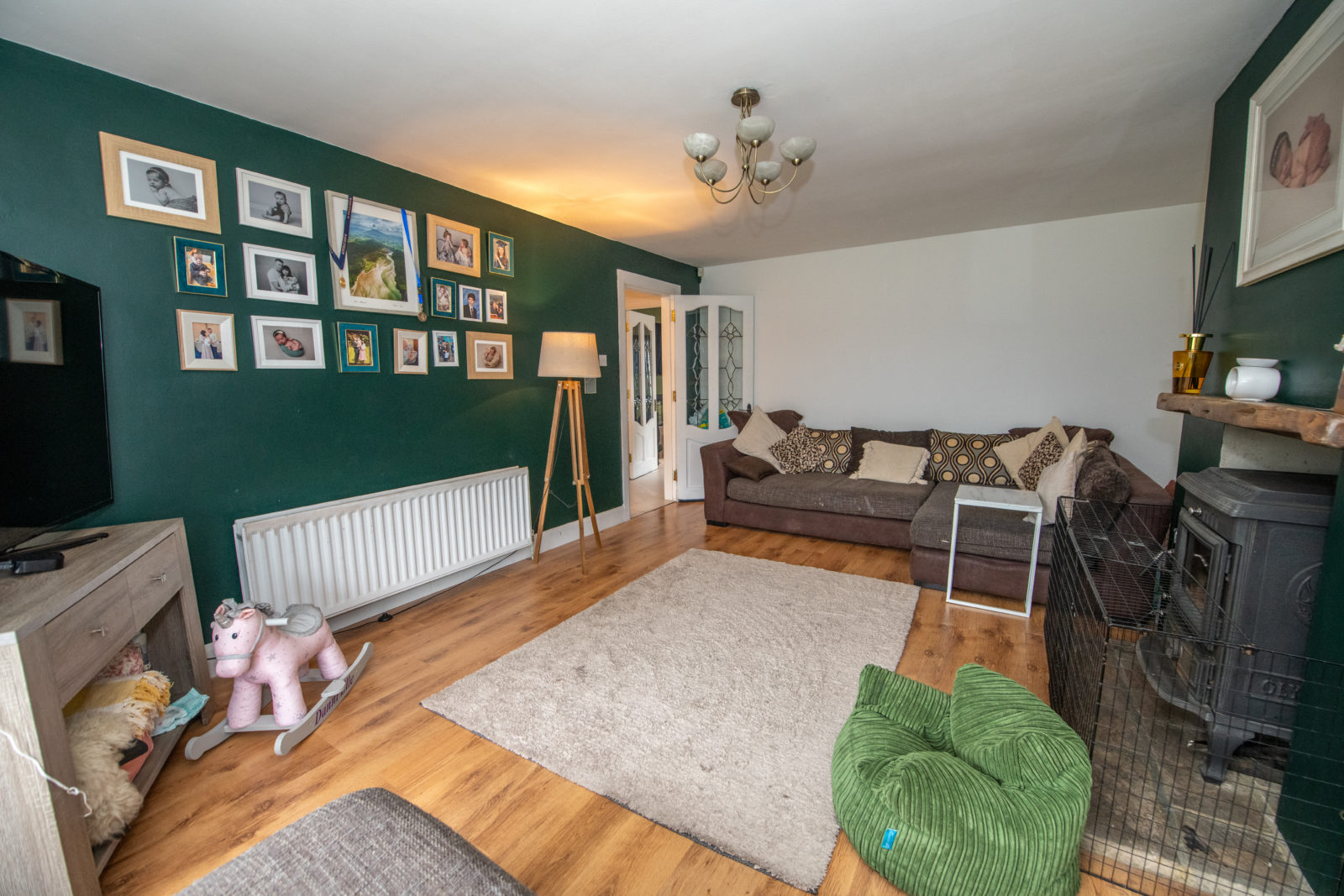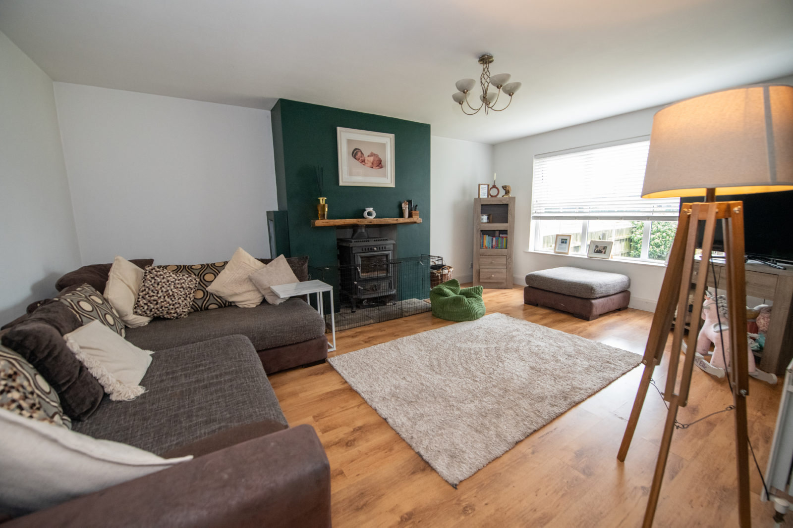 Living Room; 5.32m x 3.91m wide plank laminated flooring, solid fuel-burning stove with back boiler set on a tiled hearth, TV point
