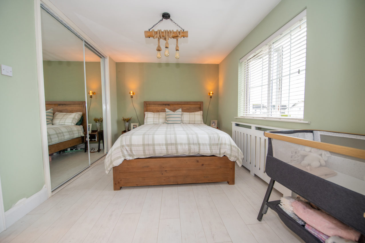 Bedroom 3; (rear) 2.66m x 2.57m wide plank laminated flooring, floor to ceiling built-in mirrored sliding wardrobes.