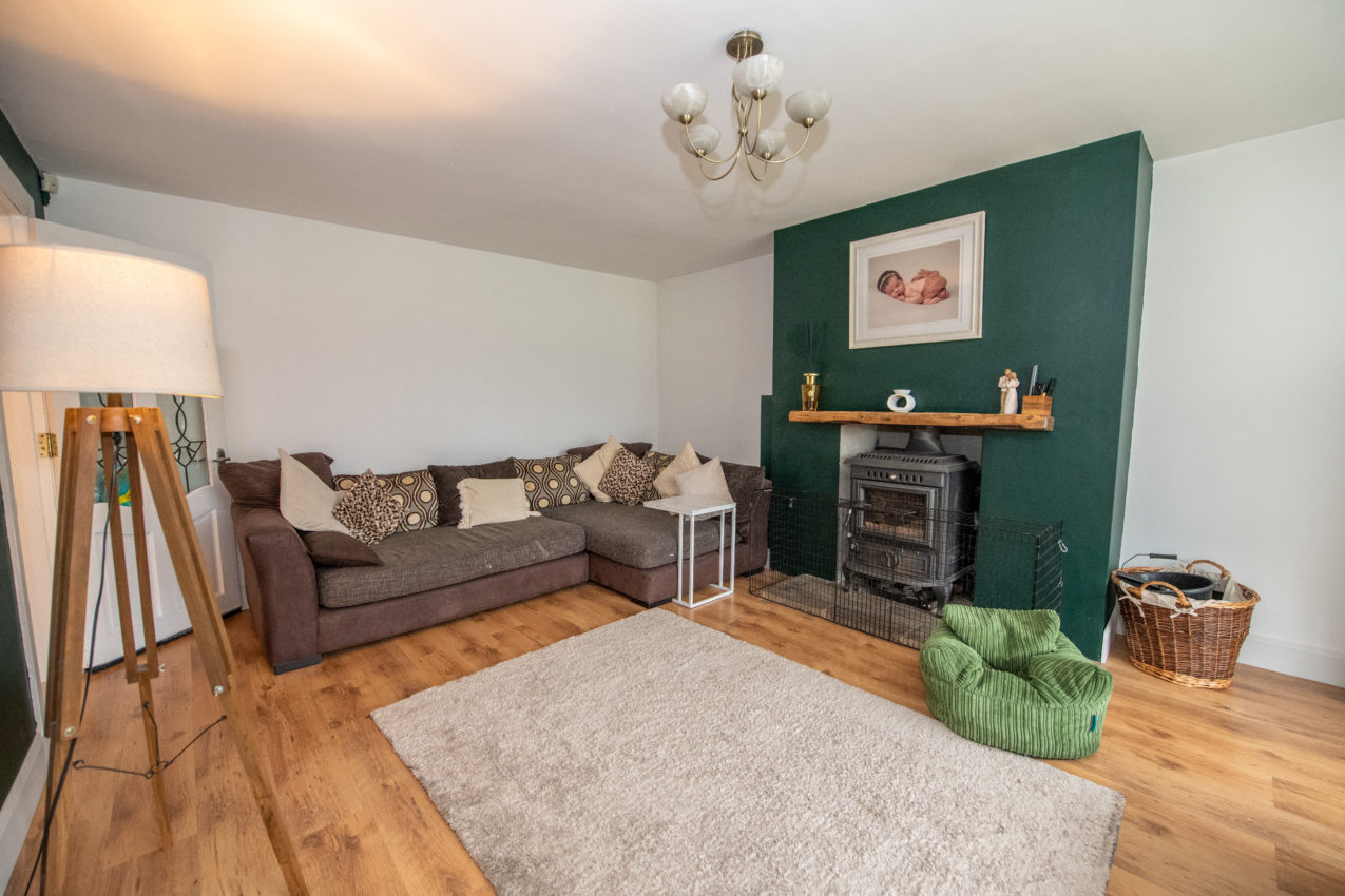 Living Room; 5.32m x 3.91m wide plank laminated flooring, solid fuel-burning stove with back boiler set on a tiled hearth, TV point