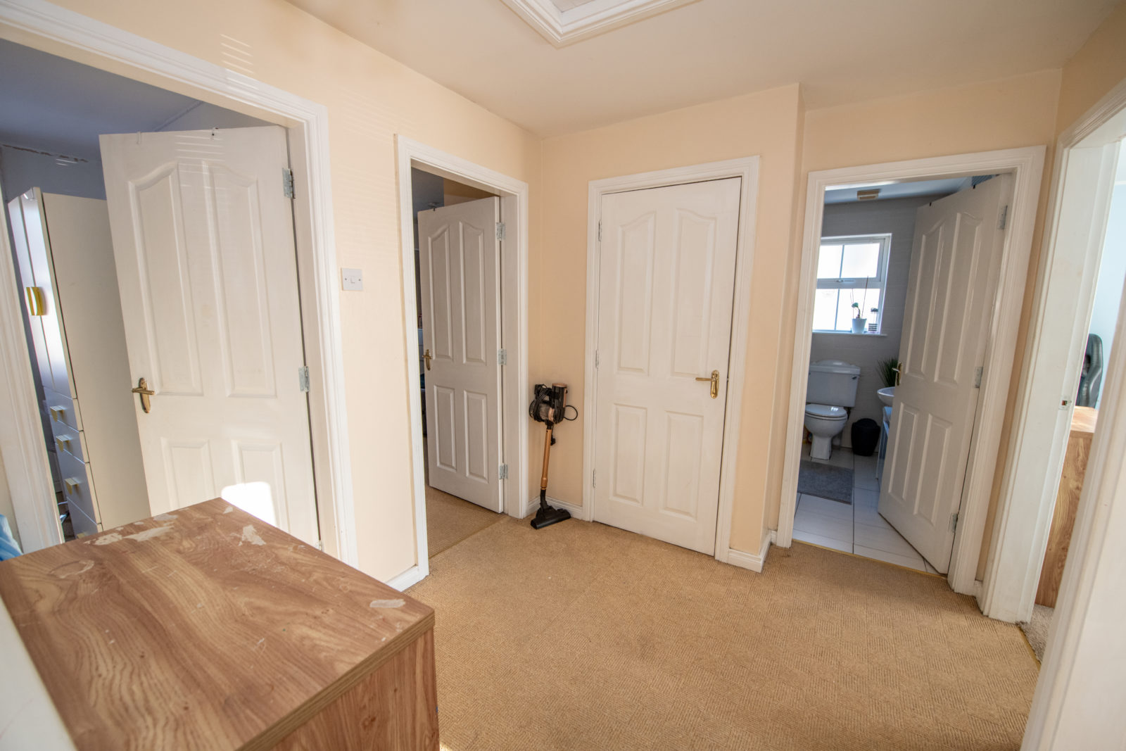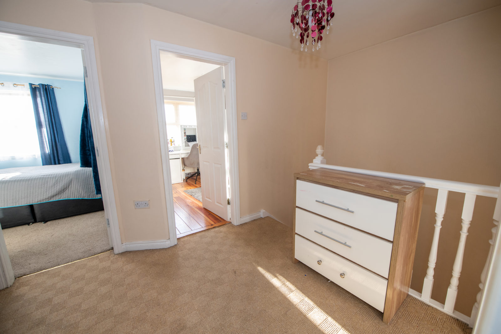 Landing; 4.13m x 2.37m, carpeted flooring, loft access, door to hot press