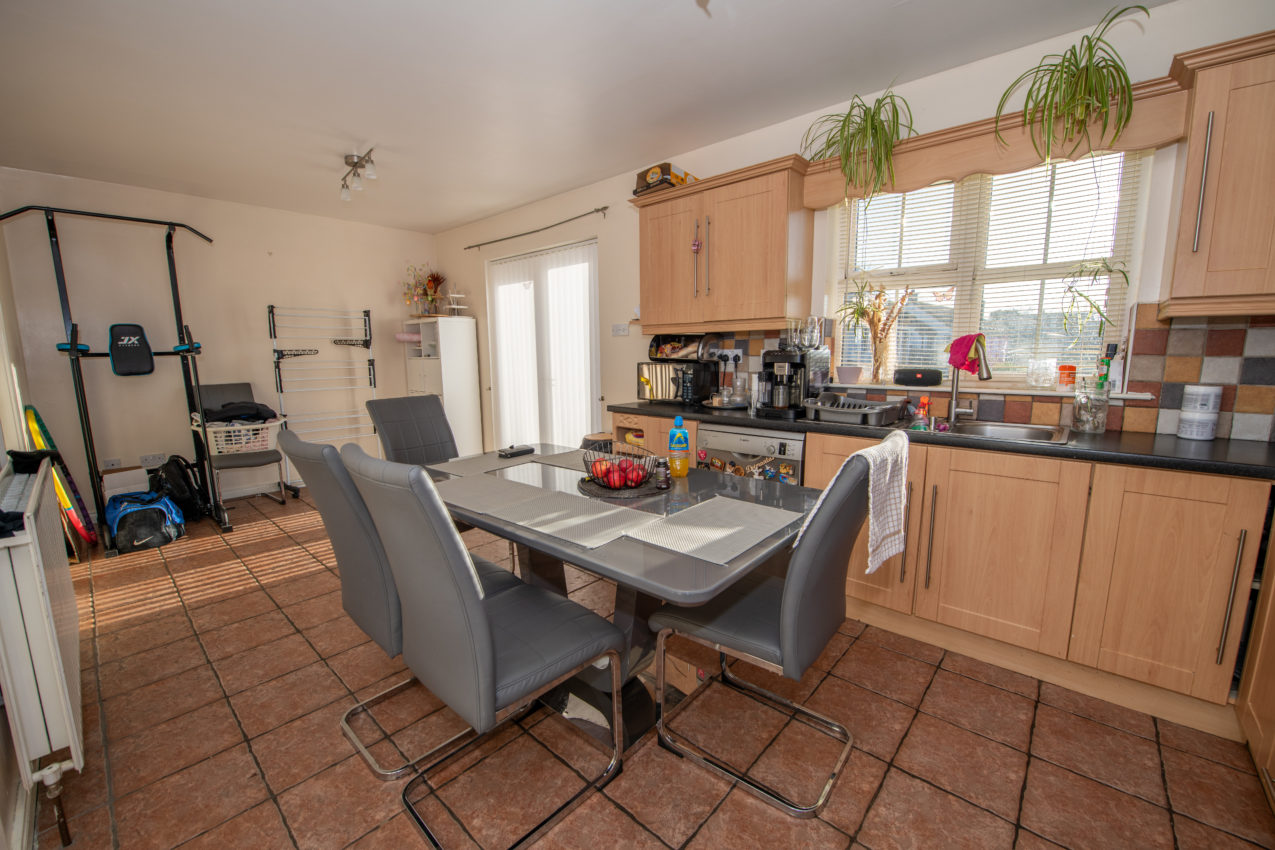 Kitchen / Dining Area; 6.51m x 3.30m comprehensively fitted with maple Shaker-style wall & base units, work surfaces with tiled surround walls, stainless steel single drainer sink unit with separate waste bowl, four-ring electric hob & oven with extractor hood overhead, semi-integrated fridge/freezer, plumbed for dishwasher, tiled flooring, fully glazed PVC doors to the rear garden, along with a separate door leading to the;