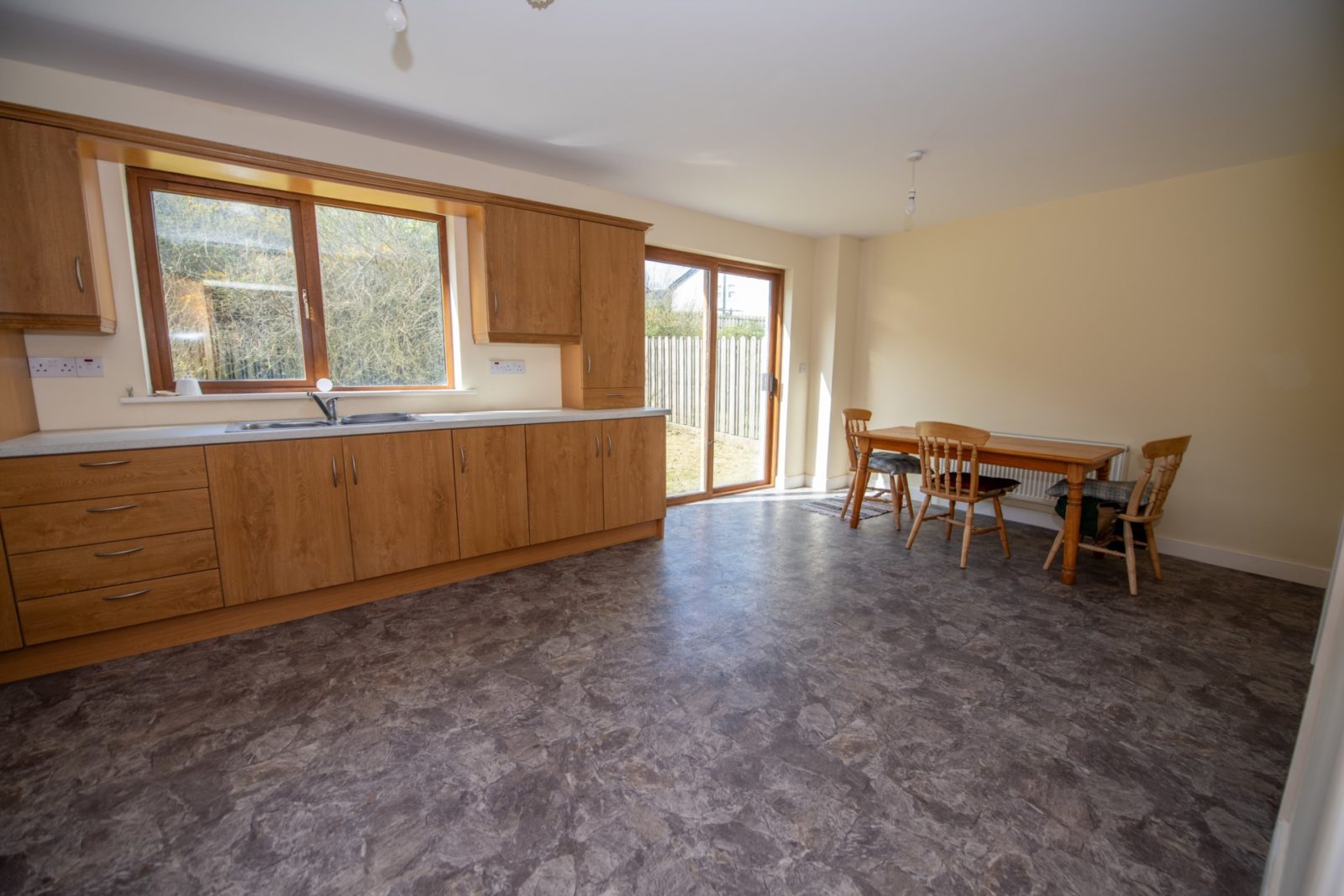 Kitchen / Dinette; 3.57m x 6.16m comprehensively fitted with oak-effect wall & base units, work surfaces, stainless steel sink unit, fully integrated fridge/freezer, electric hob & oven with extractor canopy over, vinyl flooring, double fully glazed sliding doors to the outside along with additional door to;