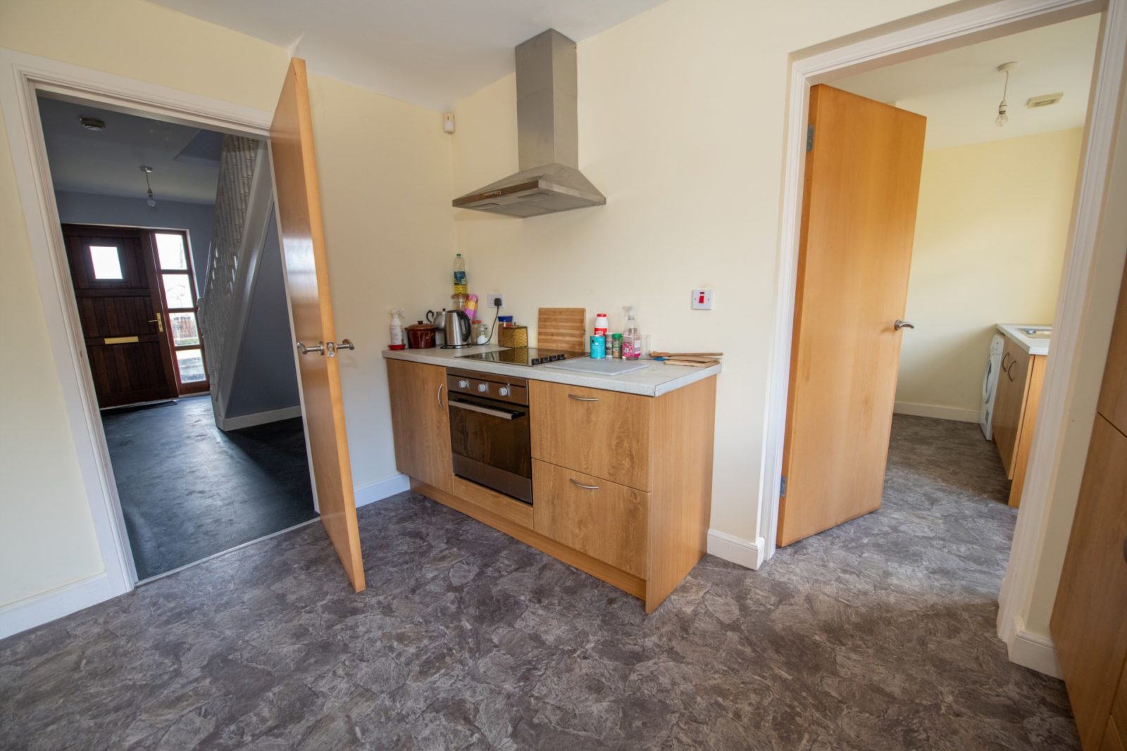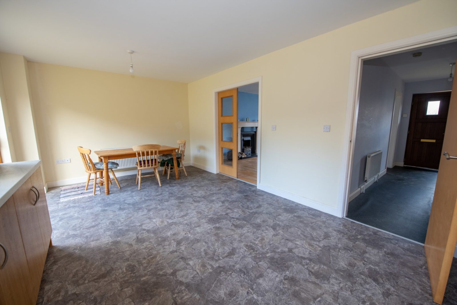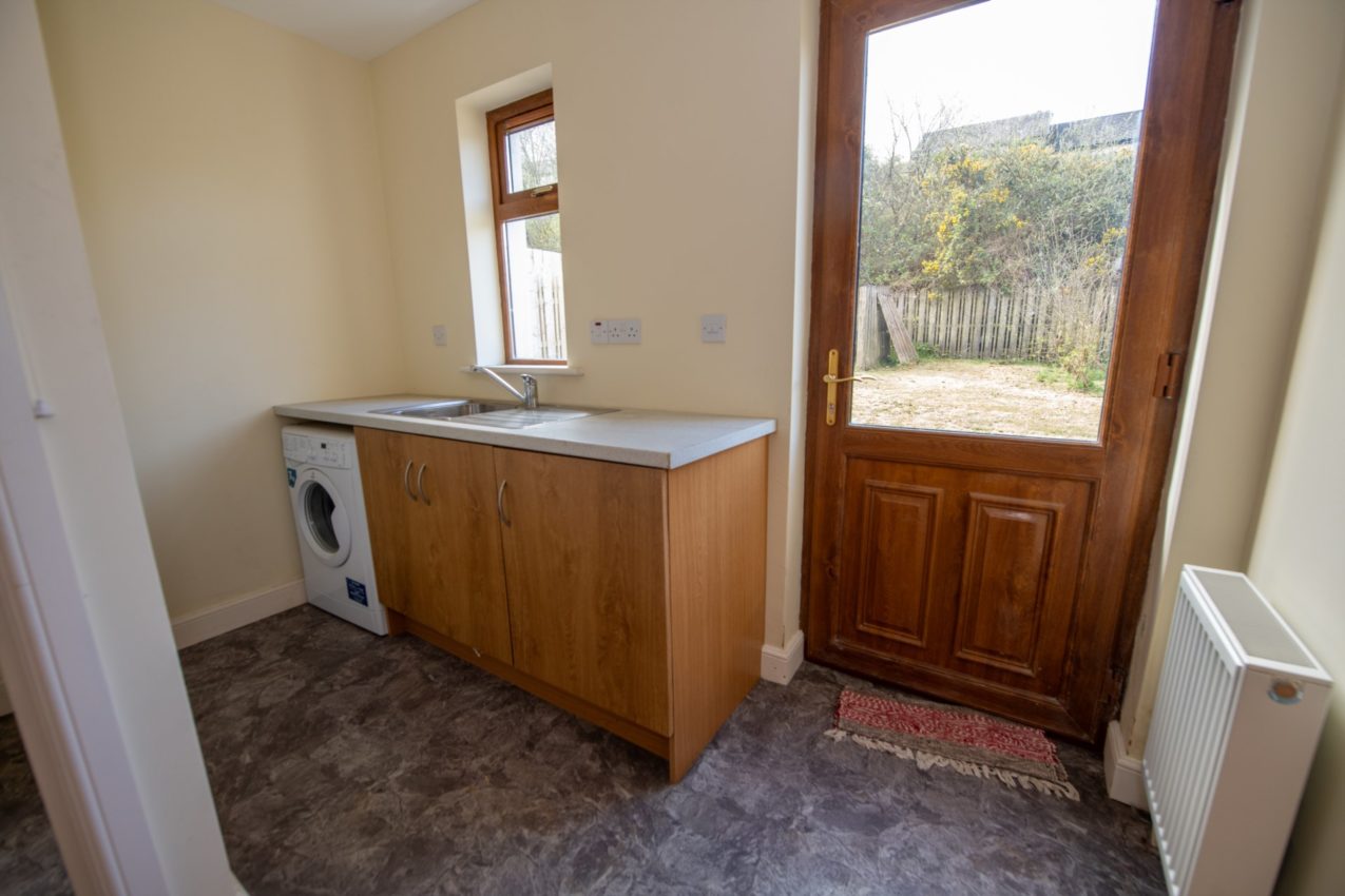 Utility Room; 2.88m x 3.19m fitted with oak-effect base units, work surfaces, stainless steel sink, plumbed for washing machine, vinyl flooring, half-glazed PVC door to the outside & internal door to;