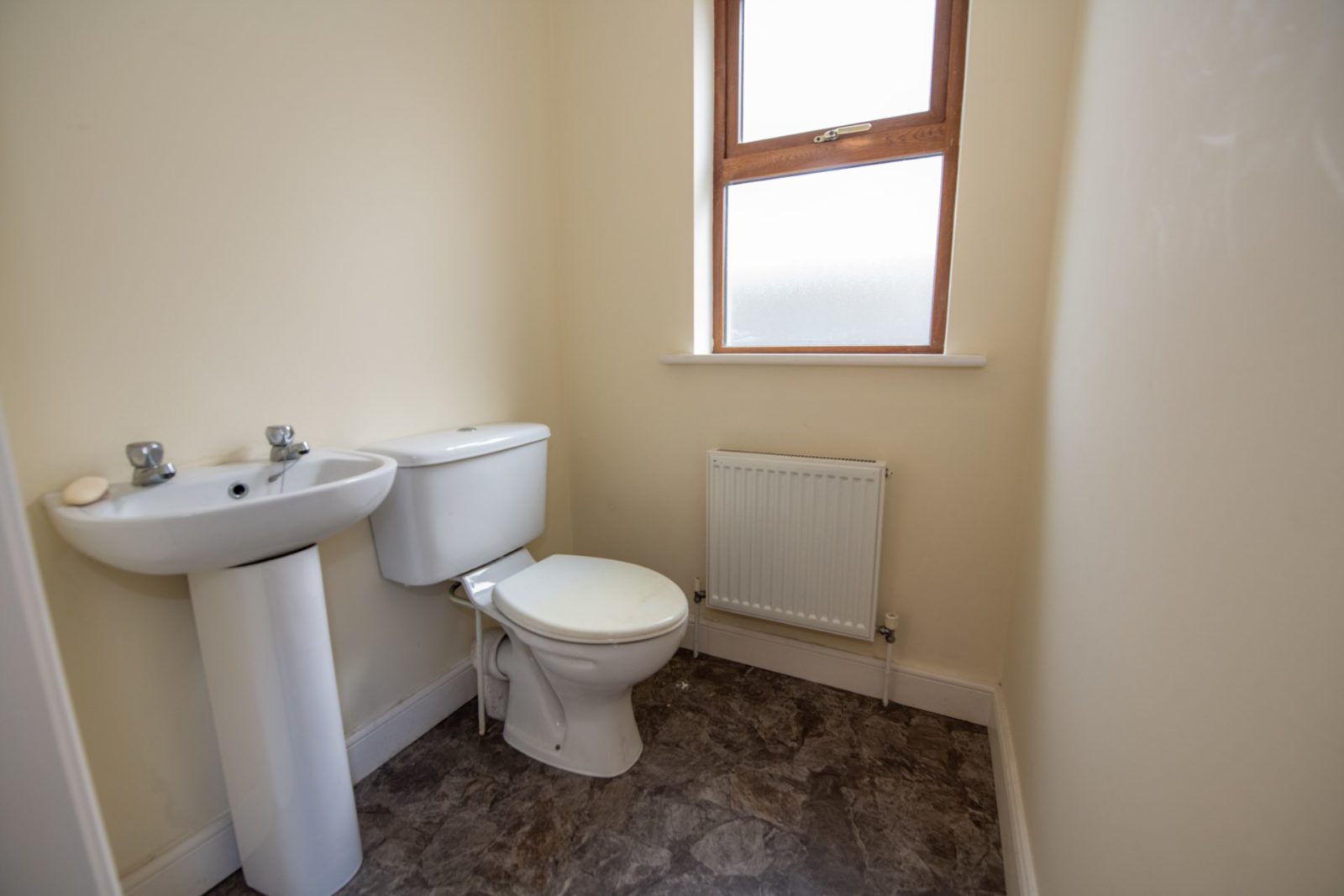 Guest WC; 1.41m x 1.45m white two-piece suite, vinyl flooring