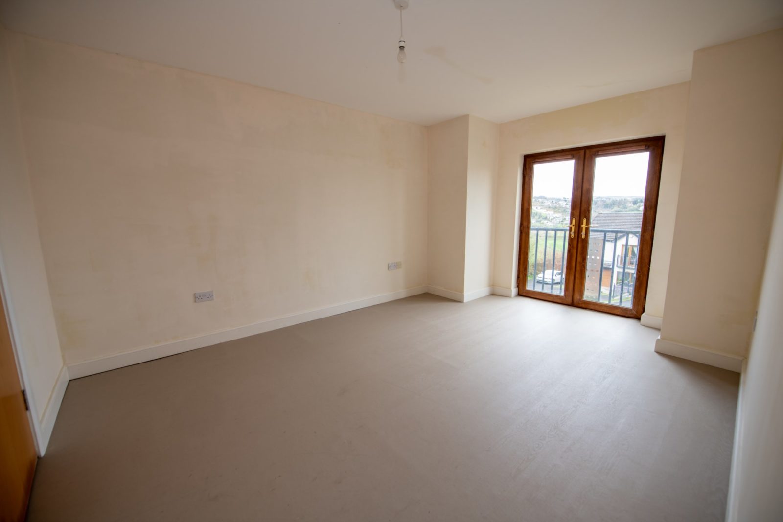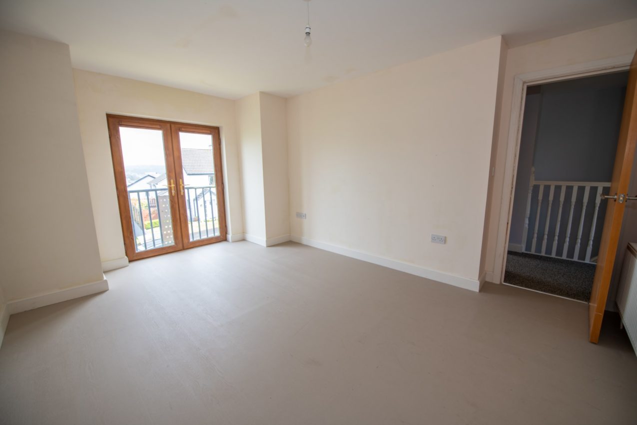 Bedroom 1; 4.68m x 3.58m (front) spacious double bedroom, vinyl flooring, double fully glazed doors to a Juliet balcony, enjoying spectacular views over Letterkenny Town Centre and Cathedral, door to;