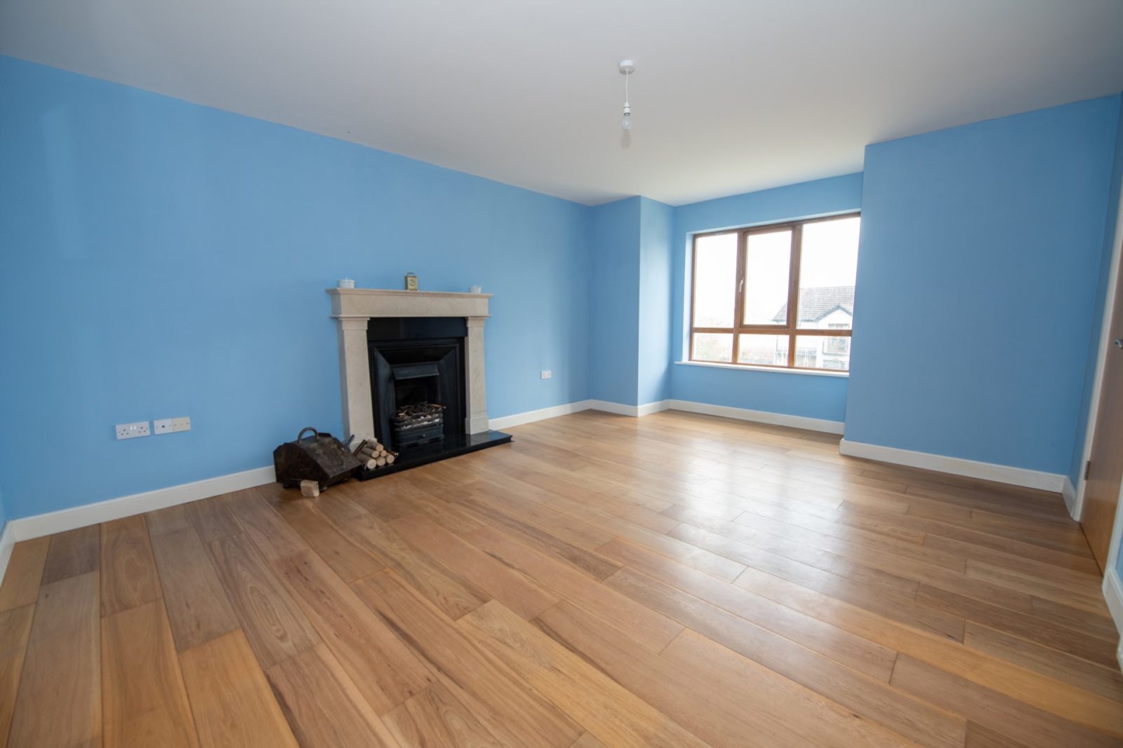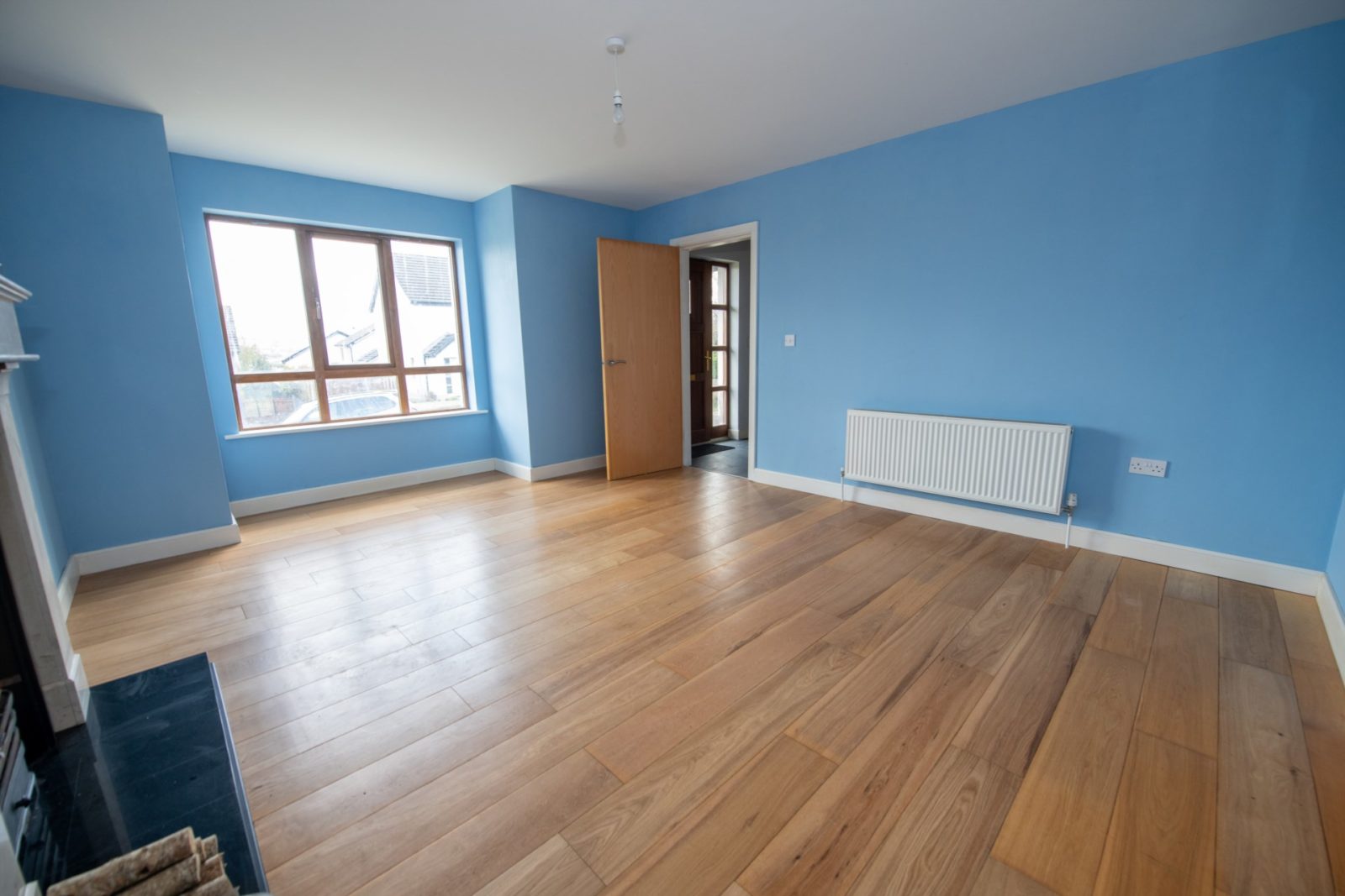 Living Room; 5.34m x 4.07m into a square bay window, solid oak white plank flooring, marble fireplace with cast iron inset & granite hearth with open fire, TV & telephone points, double glazed doors to;
