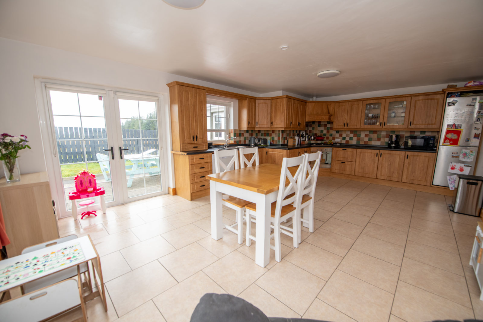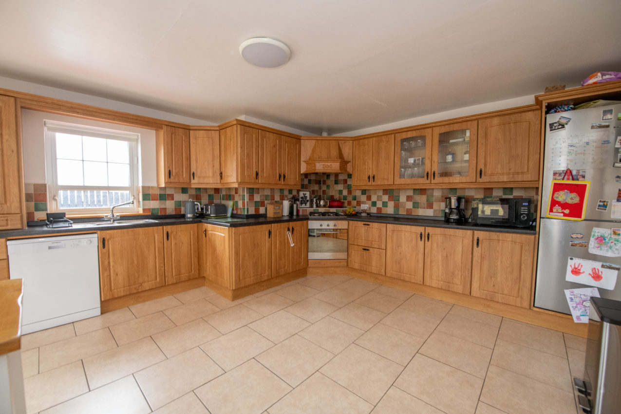 Kitchen/Dinette; 4.45m x 6.75m Spacious & comprehensively fitted with oak-effect wall & base units, incorporating glazed display cabinets, gas hob & oven with extractor hood over, stainless steel sink, work surfaces with tiled splashbacks, integrated fridge/freezer & dishwasher, tiled flooring, double fully glazed doors to the rear patio