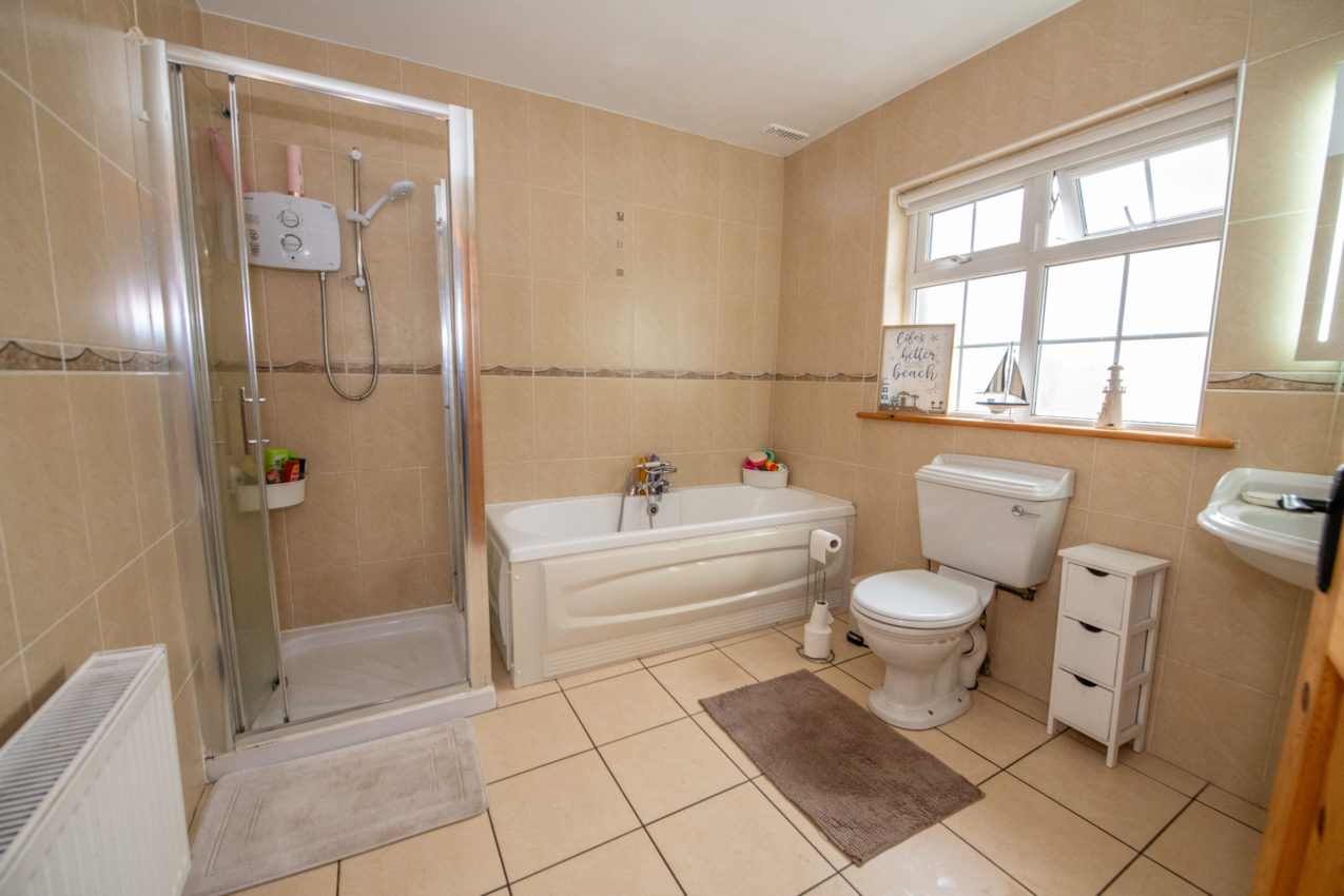 Family Bathroom; 2.73m x 2.55m white three-piece suite with separate fully tiled shower enclosure with Triton T90sr electric shower, fully tiled walls & tiled flooring, illuminated mirror