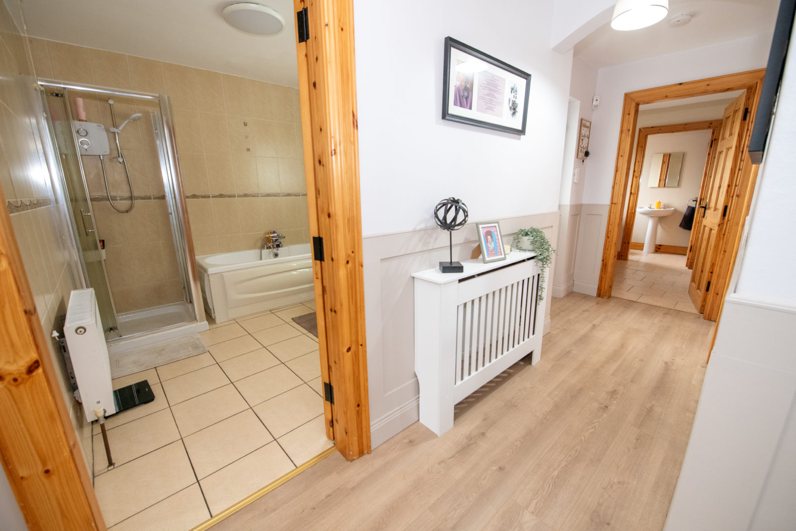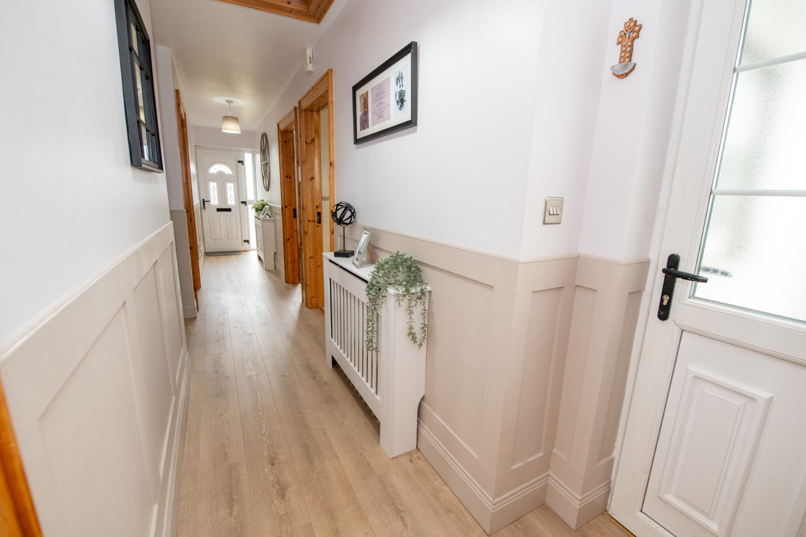 Entrance Hallway; 6.06m x 8.30m wide plank laminated flooring, half-panelled walls, loft access, door to hot press