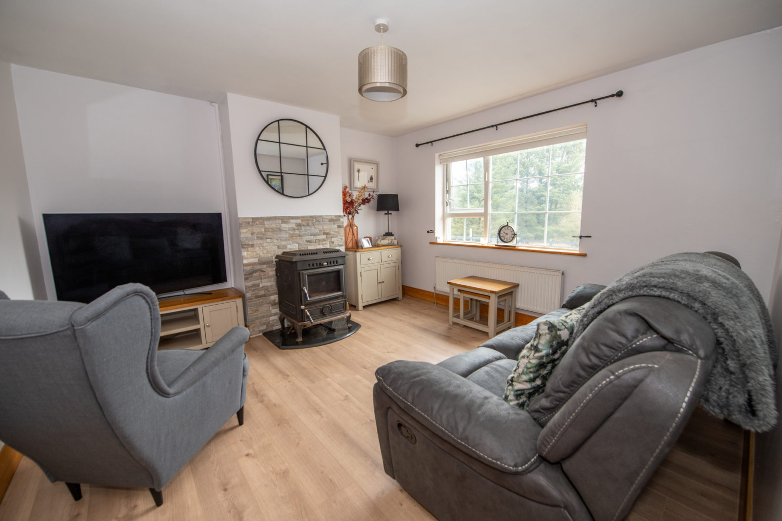 Living Room; 3.81m x 3.77m wide plank flooring, solid fuel burning stove with back boiler set on a granite hearth, complemented by a stone cladding surround, TV point